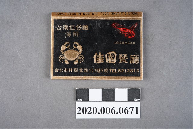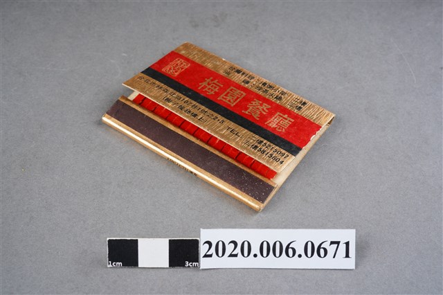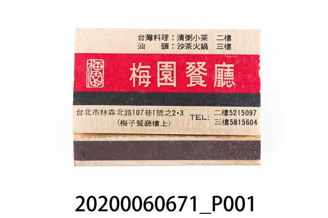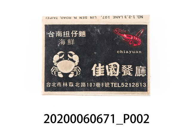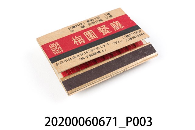 1.餐廳、飯店為主等廣告的火柴盒,可以說是早期瓦斯爐尚不盛行,又可達到廣告宣傳的小小載體。火柴盒的外觀也不限於僅有四角形,開始出現六角形或長方形盒裝,也有外觀如小屋子的造型。 2.臺灣在打火機與瓦斯爐普及前,火柴是臺灣重要的民生物資,因此火柴生產也行程專門產業,商家透過印製宣傳火柴盒作為贈品,用以販售或免費宣傳發送,盒面商標各具特色,例如臺灣火柴公司發行的「自由之火」火柴盒正面使用熊熊火把作為商標。而本件文物則有各家飯店的名稱,有些火柴盒側邊會有廣告公司與或火柴製造商,如有國榮廣告火柴公司承製、地址為新竹市中正路18號(火車站前)、電話則有各地專線(新竹、臺北、高雄)。也隨著火柴廣告公司的出現,火柴盒的廣告呈現方式也有所不同,如部份有明的商家則簡單陳述「臺北‧華西街 台南担仔麵」名稱。