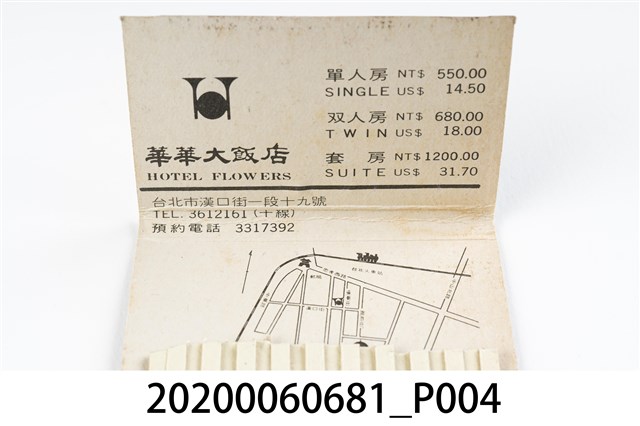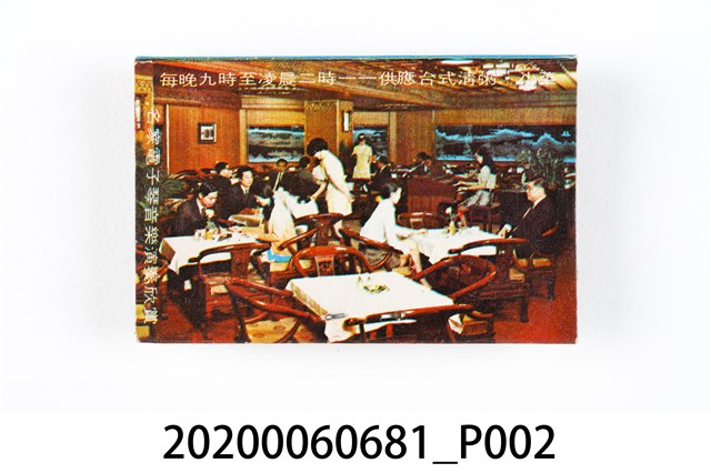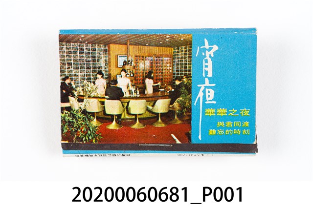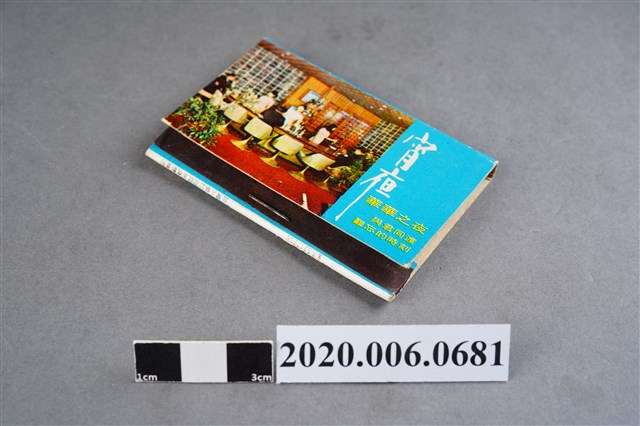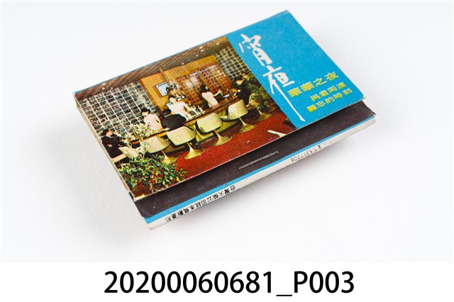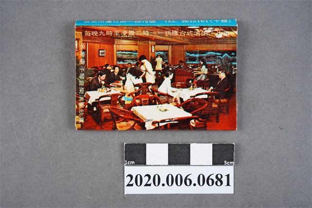 1.餐廳、飯店為主等廣告的火柴盒,可以說是早期瓦斯爐尚不盛行,又可達到廣告宣傳的小小載體。火柴盒的外觀也不限於僅有四角形,開始出現六角形或長方形盒裝,也有外觀如小屋子的造型。 2.臺灣在打火機與瓦斯爐普及前,火柴是臺灣重要的民生物資,因此火柴生產也行程專門產業,商家透過印製宣傳火柴盒作為贈品,用以販售或免費宣傳發送,盒面商標各具特色,例如臺灣火柴公司發行的「自由之火」火柴盒正面使用熊熊火把作為商標。而本件文物則有各家飯店的名稱,有些火柴盒側邊會有廣告公司與或火柴製造商,如有國榮廣告火柴公司承製、地址為新竹市中正路18號(火車站前)、電話則有各地專線(新竹、臺北、高雄)。也隨著火柴廣告公司的出現,火柴盒的廣告呈現方式也有所不同,如部份有明的商家則簡單陳述「臺北‧華西街 台南担仔麵」名稱。