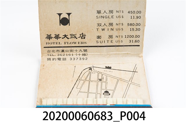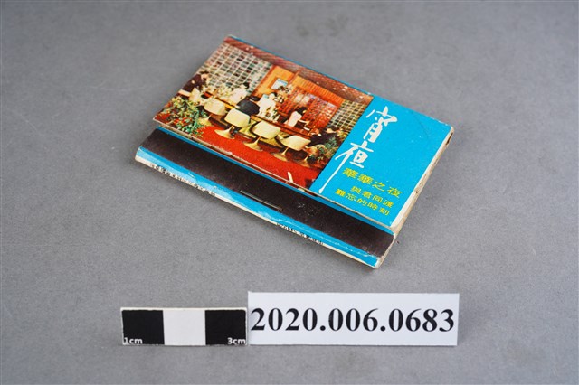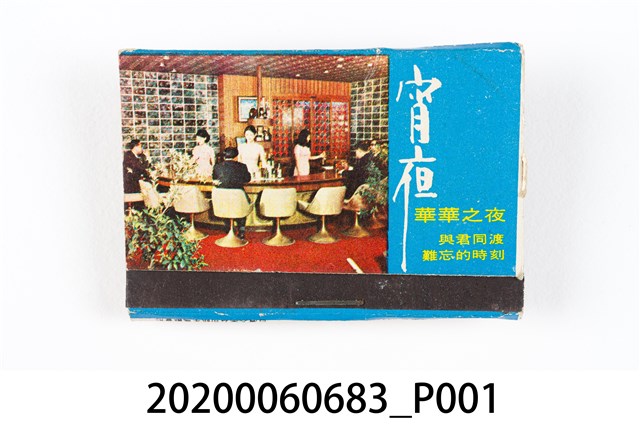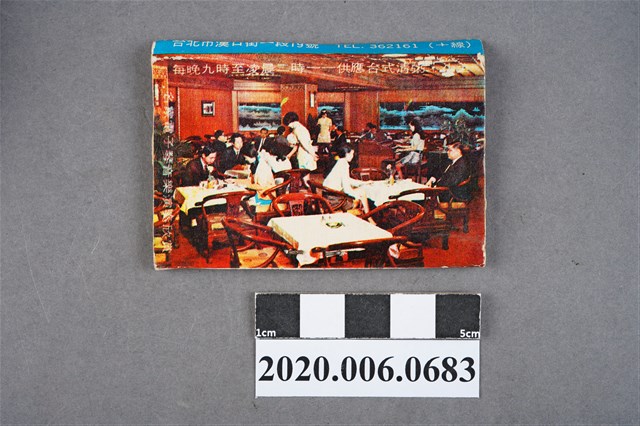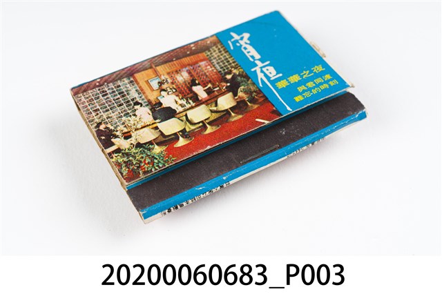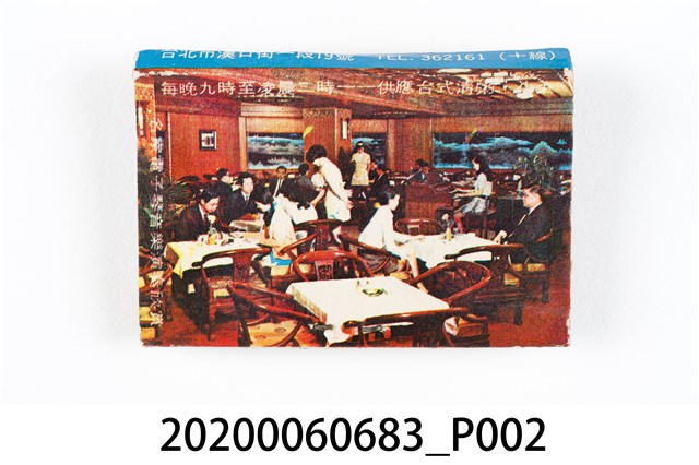 1.餐廳、飯店為主等廣告的火柴盒,可以說是早期瓦斯爐尚不盛行,又可達到廣告宣傳的小小載體。火柴盒的外觀也不限於僅有四角形,開始出現六角形或長方形盒裝,也有外觀如小屋子的造型。 2.臺灣在打火機與瓦斯爐普及前,火柴是臺灣重要的民生物資,因此火柴生產也行程專門產業,商家透過印製宣傳火柴盒作為贈品,用以販售或免費宣傳發送,盒面商標各具特色,例如臺灣火柴公司發行的「自由之火」火柴盒正面使用熊熊火把作為商標。而本件文物則有各家飯店的名稱,有些火柴盒側邊會有廣告公司與或火柴製造商,如有國榮廣告火柴公司承製、地址為新竹市中正路18號(火車站前)、電話則有各地專線(新竹、臺北、高雄)。也隨著火柴廣告公司的出現,火柴盒的廣告呈現方式也有所不同,如部份有明的商家則簡單陳述「臺北‧華西街 台南担仔麵」名稱。