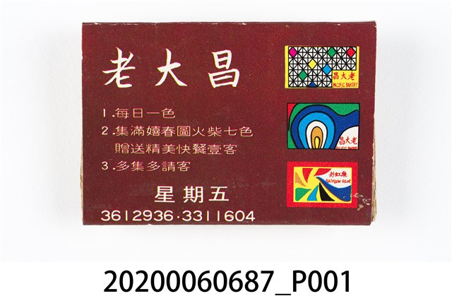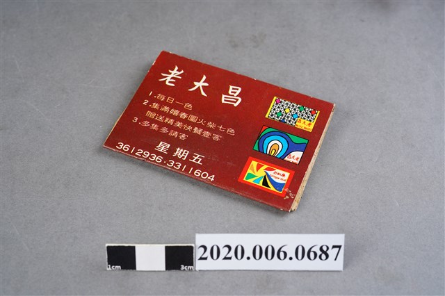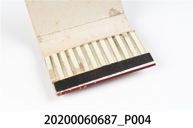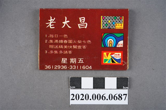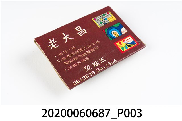 1.餐廳、飯店為主等廣告的火柴盒,可以說是早期瓦斯爐尚不盛行,又可達到廣告宣傳的小小載體。火柴盒的外觀也不限於僅有四角形,開始出現六角形或長方形盒裝,也有外觀如小屋子的造型。 2.臺灣在打火機與瓦斯爐普及前,火柴是臺灣重要的民生物資,因此火柴生產也行程專門產業,商家透過印製宣傳火柴盒作為贈品,用以販售或免費宣傳發送,盒面商標各具特色,例如臺灣火柴公司發行的「自由之火」火柴盒正面使用熊熊火把作為商標。而本件文物則有各家飯店的名稱,有些火柴盒側邊會有廣告公司與或火柴製造商,如有國榮廣告火柴公司承製、地址為新竹市中正路18號(火車站前)、電話則有各地專線(新竹、臺北、高雄)。也隨著火柴廣告公司的出現,火柴盒的廣告呈現方式也有所不同,如部份有明的商家則簡單陳述「臺北‧華西街 台南担仔麵」名稱。