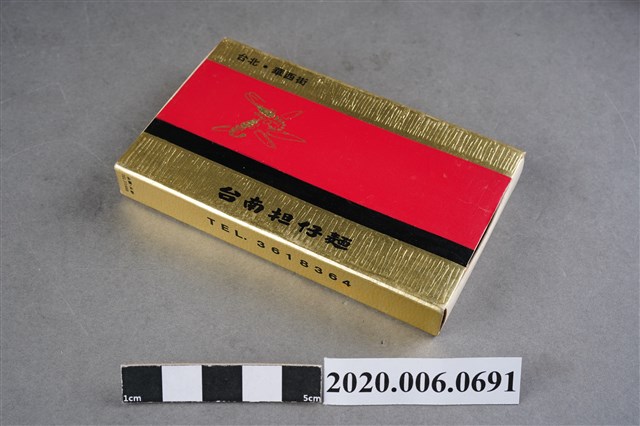 1.餐廳、飯店為主等廣告的火柴盒,可以說是早期瓦斯爐尚不盛行,又可達到廣告宣傳的小小載體。火柴盒的外觀也不限於僅有四角形,開始出現六角形或長方形盒裝,也有外觀如小屋子的造型。 2.臺灣在打火機與瓦斯爐普及前,火柴是臺灣重要的民生物資,因此火柴生產也行程專門產業,商家透過印製宣傳火柴盒作為贈品,用以販售或免費宣傳發送,盒面商標各具特色,例如臺灣火柴公司發行的「自由之火」火柴盒正面使用熊熊火把作為商標。而本件文物則有各家飯店的名稱,有些火柴盒側邊會有廣告公司與或火柴製造商,如有國榮廣告火柴公司承製、地址為新竹市中正路18號(火車站前)、電話則有各地專線(新竹、臺北、高雄)。也隨著火柴廣告公司的出現,火柴盒的廣告呈現方式也有所不同,如部份有明的商家則簡單陳述「臺北‧華西街 台南担仔麵」名稱。