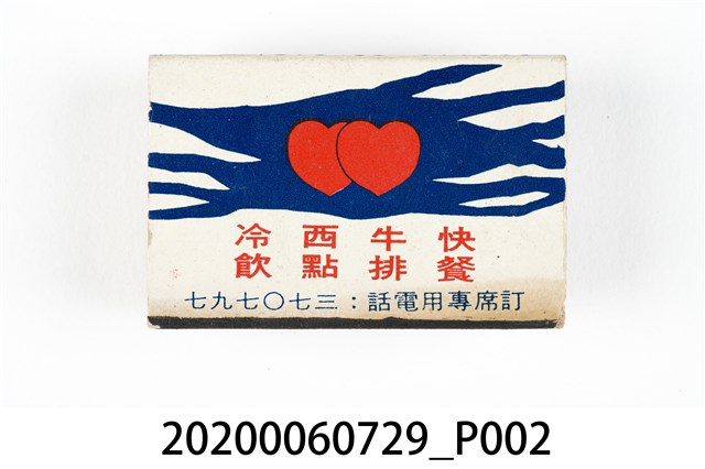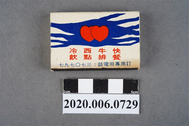 1.內容主要以餐廳、菜館、音響廳、歌廳、夜總會與俱樂部為主的廣告火柴盒。本件文物則有餐廳、店家、歌廳或酒家的名稱。有些火柴盒側邊會有廣告公司與或火柴製造商,如有國榮廣告火柴公司承製、地址為新竹市中正路18號(火車站前)、電話則有各地專線(新竹、臺北、高雄)。也隨著火柴廣告公司的出現,火柴盒的廣告呈現方式也有所不同,類似現今商標LOGO的呈現方式。本件文物的各式餐廳,可以發現類型豐富,包含中式料理、西式料理、越南料理、粵菜料理、日式料理、蒙古烤肉、咖啡店、海產料理。且類型也相當多元,正規西餐廳、一般餐廳、飯店、俱樂部、歌廳、酒家等皆透過火柴盒廣告與宣傳。2.臺灣在打火機與瓦斯爐普及前,火柴是臺灣重要的民生物資,因此火柴生產也行程專門產業,商家透過印製宣傳火柴盒作為贈品,用以販售或免費宣傳發送,盒面商標各具特色,例如臺灣火柴公司發行的「自由之火」火柴盒正面使用熊熊火把作為商標。