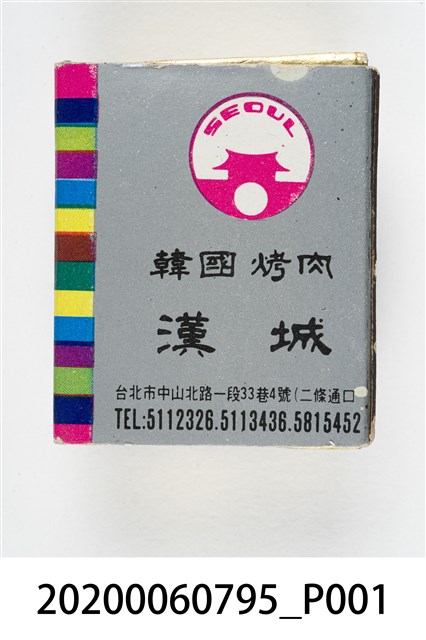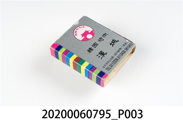 1.內容主要以餐廳、菜館、音響廳、歌廳、夜總會與俱樂部為主的廣告火柴盒。本件文物則有餐廳、店家、歌廳或酒家的名稱。有些火柴盒側邊會有廣告公司與或火柴製造商,如有國榮廣告火柴公司承製、地址為新竹市中正路18號(火車站前)、電話則有各地專線(新竹、臺北、高雄)。也隨著火柴廣告公司的出現,火柴盒的廣告呈現方式也有所不同,類似現今商標LOGO的呈現方式。本件文物的各式餐廳,可以發現類型豐富,包含中式料理、西式料理、越南料理、粵菜料理、日式料理、蒙古烤肉、咖啡店、海產料理。且類型也相當多元,正規西餐廳、一般餐廳、飯店、俱樂部、歌廳、酒家等皆透過火柴盒廣告與宣傳。2.臺灣在打火機與瓦斯爐普及前,火柴是臺灣重要的民生物資,因此火柴生產也行程專門產業,商家透過印製宣傳火柴盒作為贈品,用以販售或免費宣傳發送,盒面商標各具特色,例如臺灣火柴公司發行的「自由之火」火柴盒正面使用熊熊火把作為商標。
