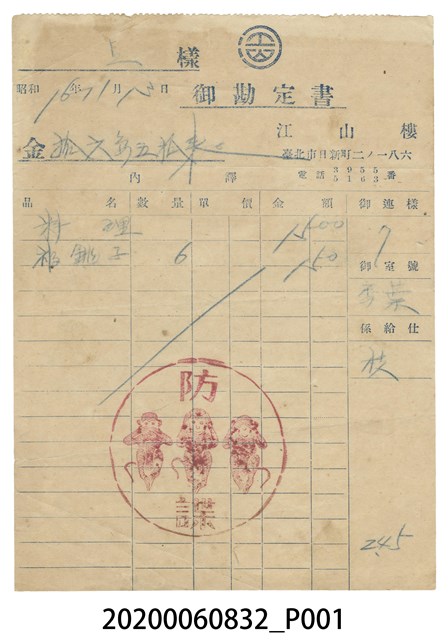 1.本物件為酒家收據,收據上寫有品項、單價及總金額,最後並有餐廳名稱、住址與電話。 2.在早期酒家是個非常高檔的娛樂場所,藝旦原則上是賣藝不賣身,出入分子多為政要、鉅商、墨客騷人,林獻堂、蔣渭水、梁啟超、後藤新平都曾是酒家的座上賓,當時的酒家類似17、18世紀歐洲的沙龍,日治時期,臺灣人所謂的酒家以「蓬萊閣」、「東薈芳」、「江山樓」和「春風得意樓」等最為著名,然並不僅止於喫花酒的層次而已,最重要的歷史事件之一是蔣渭水為首的臺灣工友聯盟在1928年蓬萊閣舉行成立大會,會後合照,留下了背景在蓬萊閣樓門柱上垂掛「同胞需團結,團結真有力」的長幅布條。