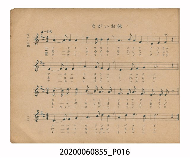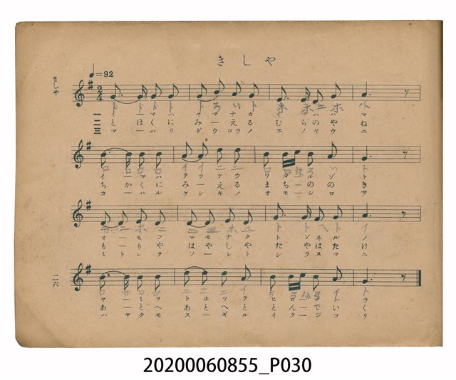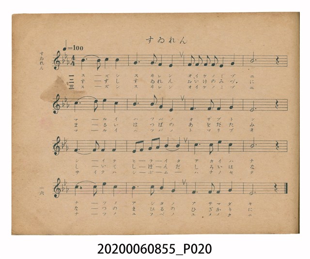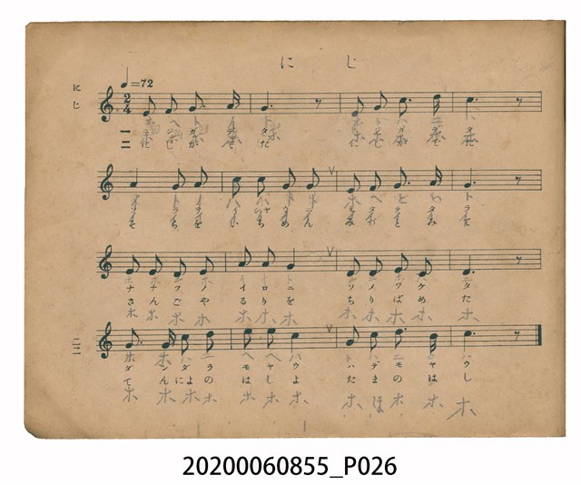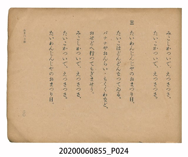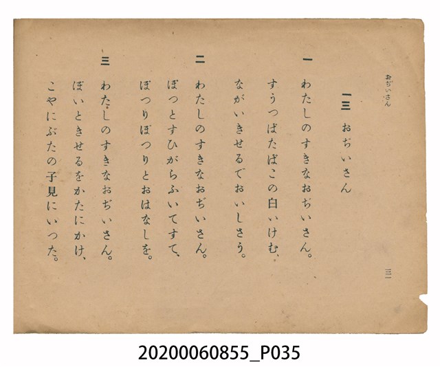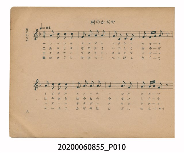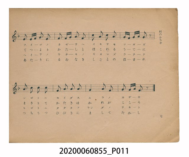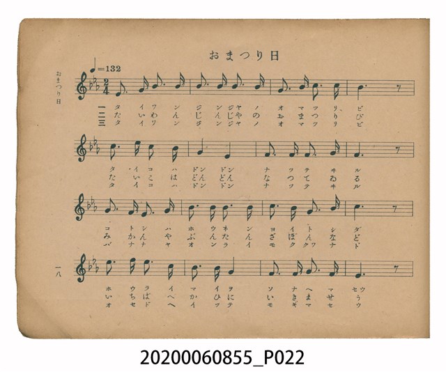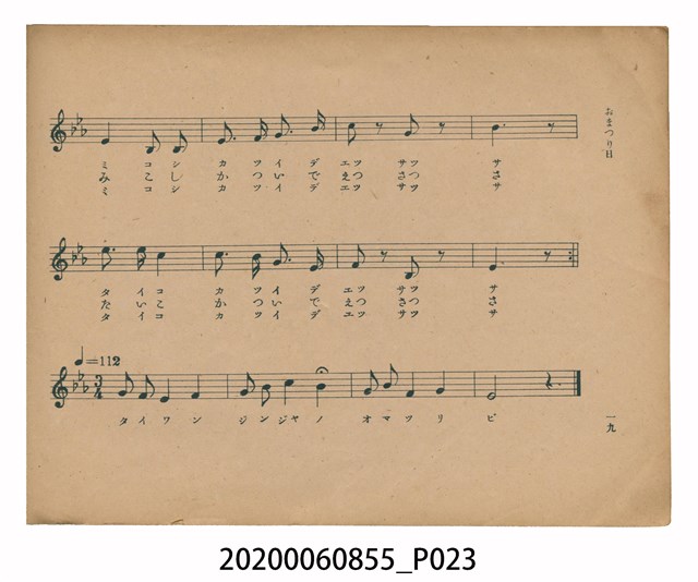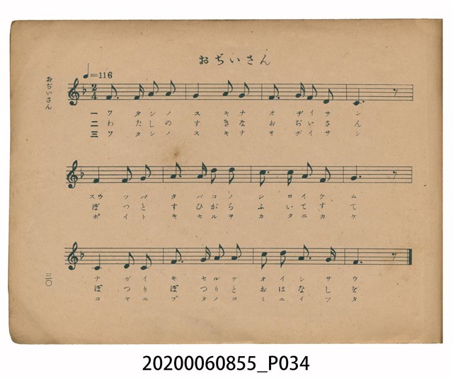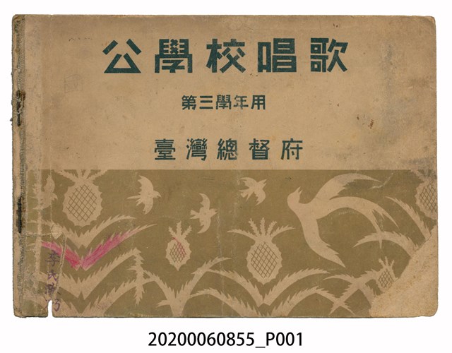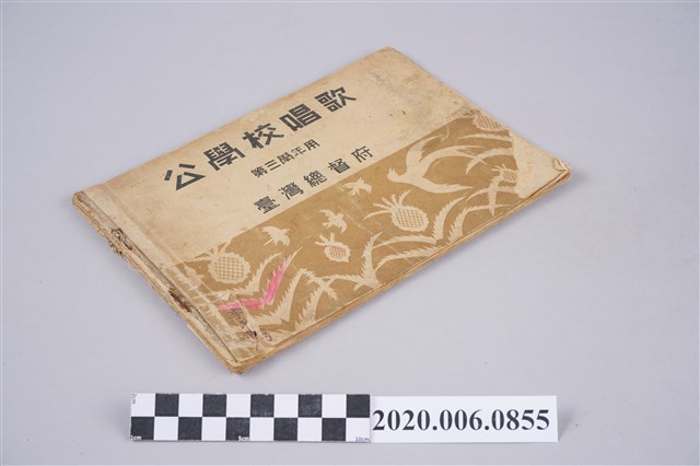 2.公學校唱歌課,1896年設置國語傳習所時,乙科就有「唱歌」科,1898年改制公學校時同樣保留「唱歌」。1915年總督府編纂的《公學校唱歌集》(全1冊),公學校的唱歌科才有第一本教科書。1934年至1935年之間,總督府再度發行唱歌科教科書《公學校唱歌》,且已將適用於六個學年的唱歌教材分開編纂,本件為第三年的唱歌課教科書。