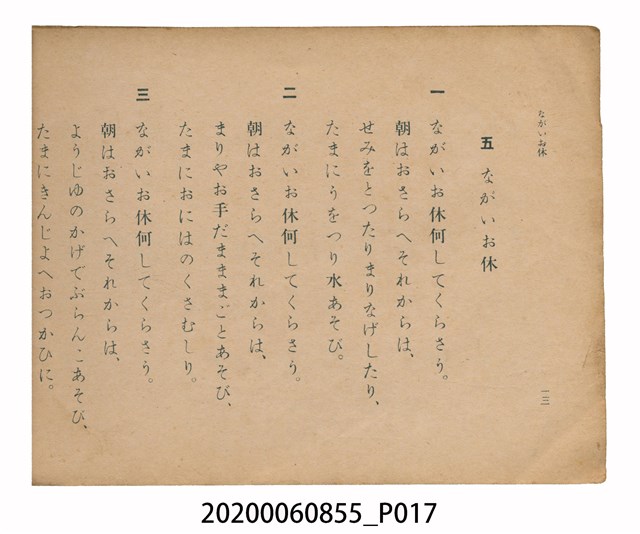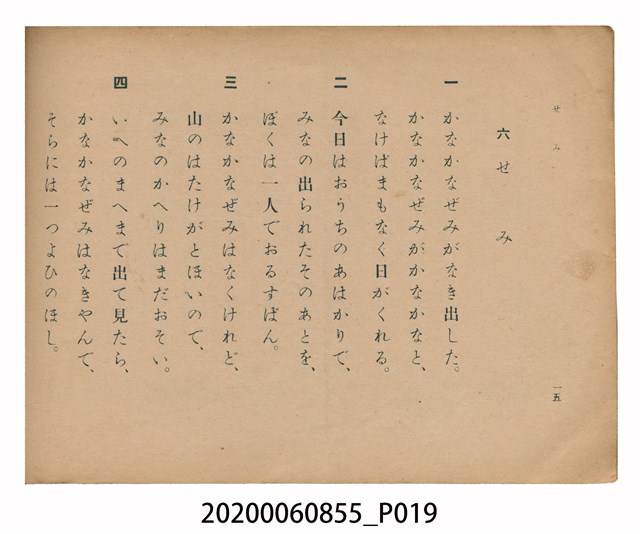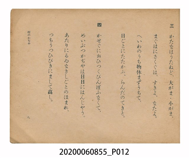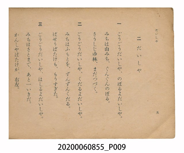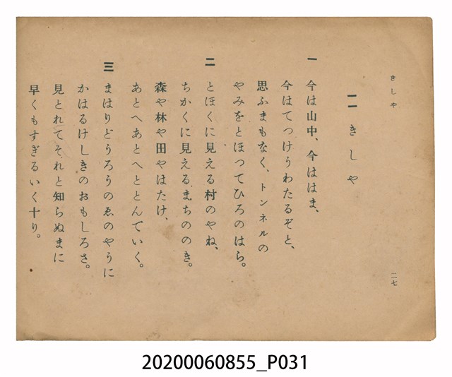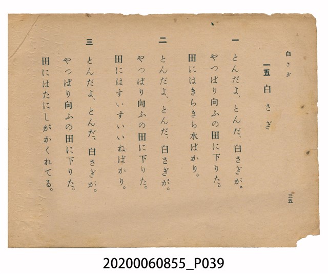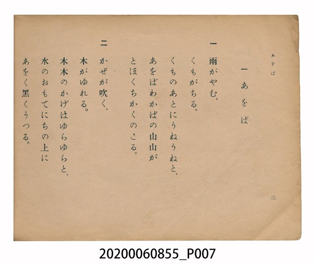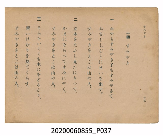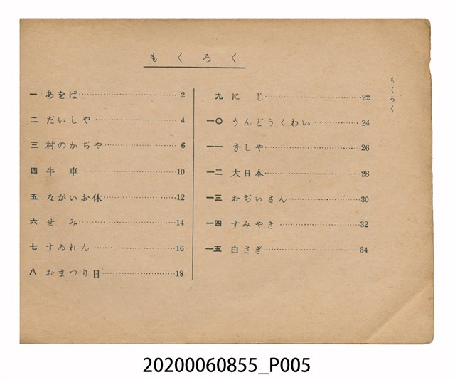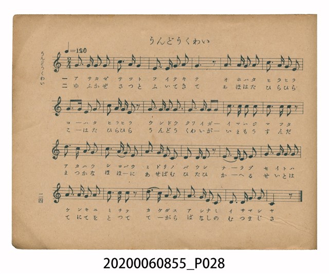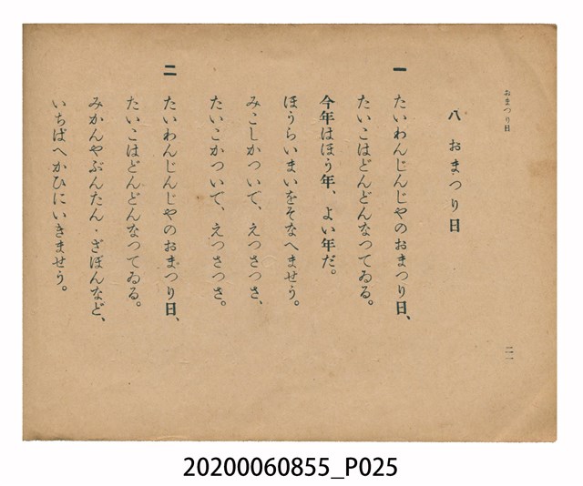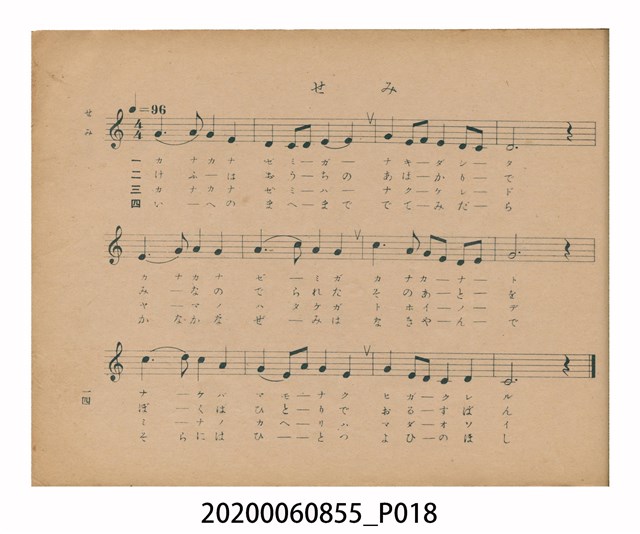 2.公學校唱歌課,1896年設置國語傳習所時,乙科就有「唱歌」科,1898年改制公學校時同樣保留「唱歌」。1915年總督府編纂的《公學校唱歌集》(全1冊),公學校的唱歌科才有第一本教科書。1934年至1935年之間,總督府再度發行唱歌科教科書《公學校唱歌》,且已將適用於六個學年的唱歌教材分開編纂,本件為第三年的唱歌課教科書。