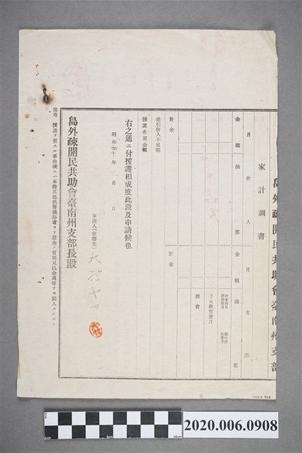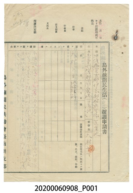 1.本件長18.4公分、寬26.2公分、高0.1公分。文件為申請人大村ヤマ的島外疏開民申請書,表上需填寫本籍、現居所、申請人出生年月日、職業、申請援助的原因、希望的援助金額,以及家中是否有應召出征或戰死的家族親人等資訊。