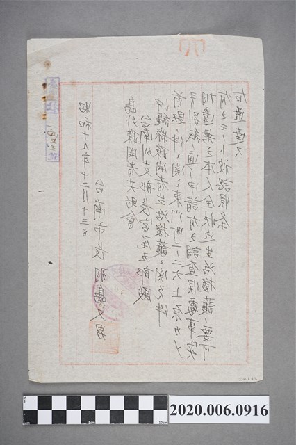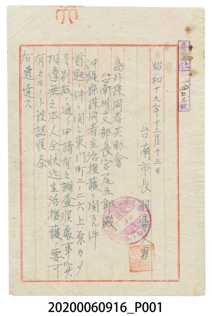 1.本件長18.4公分、寬26.2公分、高0.1公分。文件為台南市長羽鳥又男給島外疏開者共助會臺南州支部長宮尾五郎的公文,主旨為沖繩縣疏開者生活援護相關之件,主要是針對申請人的島外疏開民生活援護申請書進行調查,以確認其真實性。 2.疏開是指日本政府有計畫下將人口密集的臺北、基隆、高雄等地的居民疏散至山邊或鄉下,以減少人民受空襲轟炸的死傷。二戰末期,美國在太平洋戰爭採取跳島戰術,佔領菲律賓、攻佔沖繩島,對臺灣指轟炸不佔領。1944年日本政府宣布「疏開綱要」,美軍亦開始空襲臺北至高雄等重要城市,1945年對高雄進行大轟炸。本件即是此背景下產生,原居住於於沖繩縣的島民被疏開至臺灣臺南東門一帶,並經過申請後,其生活費由日本政府負擔。