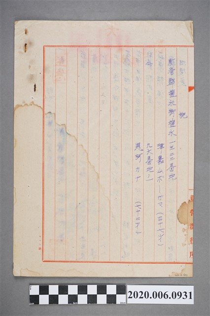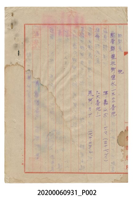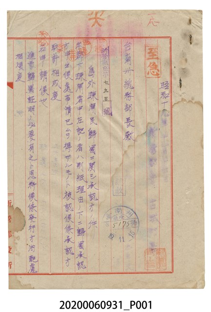 1.本件長17.7公分、寬25.5公分、高0.1公分。本件主要為新營郡守古城邦嘉給臺南州總務部長傳遞有關島外疏開者歸國承認相關公文。2.戰時災害保護法係因應大東亞戰爭(太平洋戰爭)所頒布的法案。依敕令第629號,施行範圍涵蓋朝鮮、臺灣與樺太半島(今庫頁島南部)。臺灣方面,則依照臺灣總督府府令第136號(1942年8月19日總督長谷川清頒布)的戰時災害保護法施行規則辦理,其內容亦包含防空法相關規定、戰時設施損害、撫恤金等內容。 3.疏開是指日本政府有計畫下將人口密集的臺北、基隆、高雄等地的居民疏散至山邊或鄉下,以減少人民受空襲轟炸的死傷。二戰末期,美國在太平洋戰爭採取跳島戰術,佔領菲律賓、攻佔沖繩島,對臺灣指轟炸不佔領。1944年日本政府宣布「疏開綱要」,美軍亦開始空襲臺北至高雄等重要城市,1945年對高雄進行大轟炸。