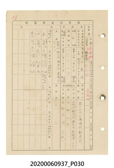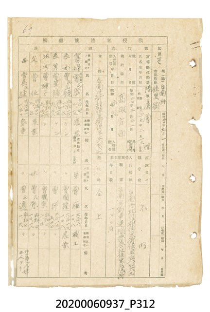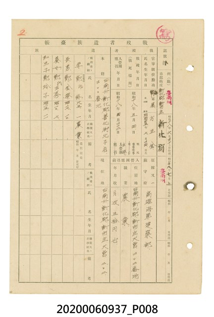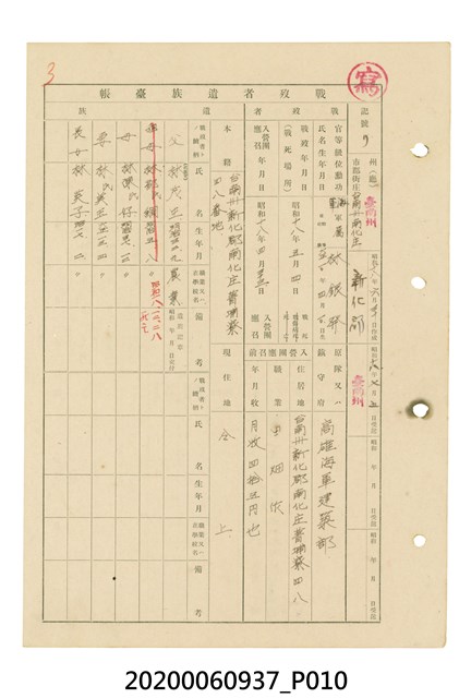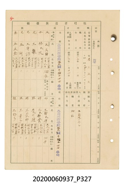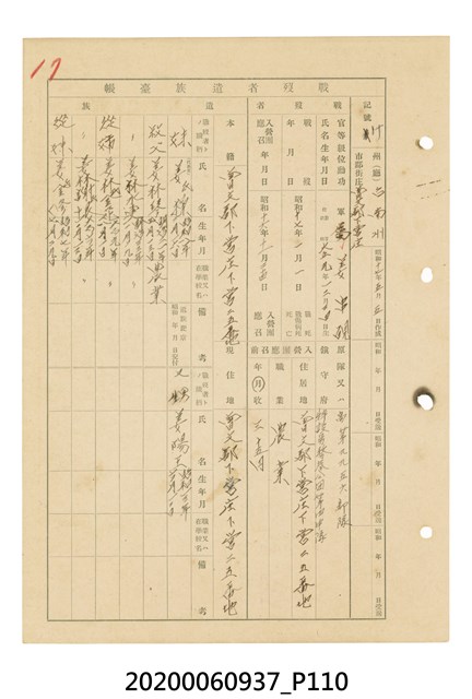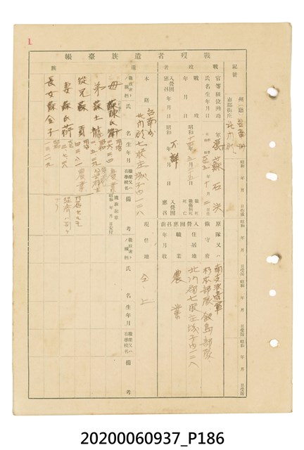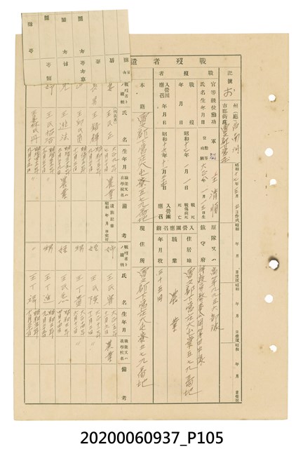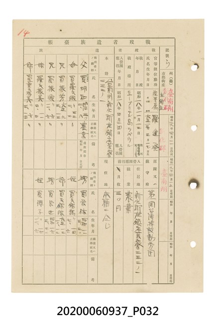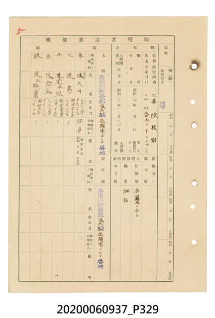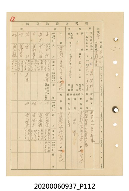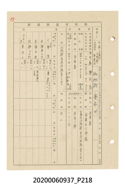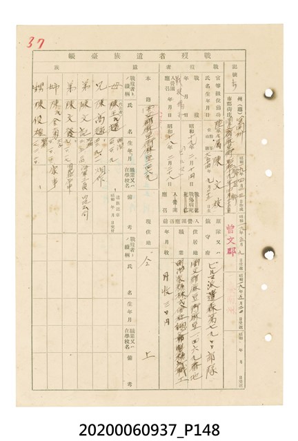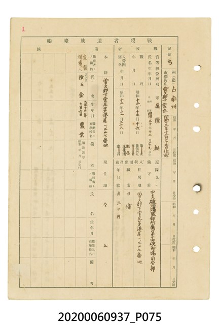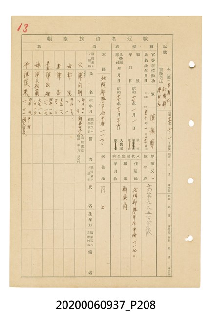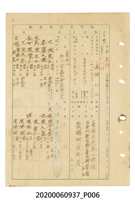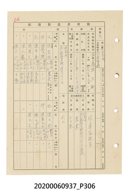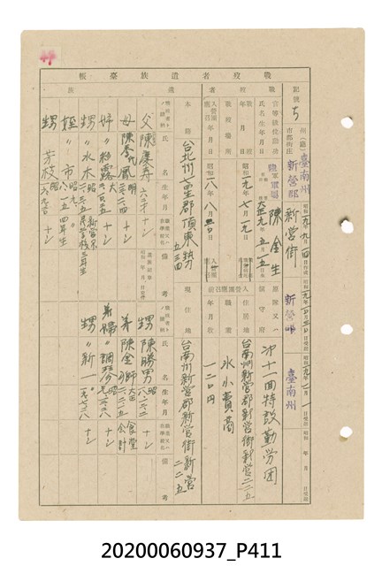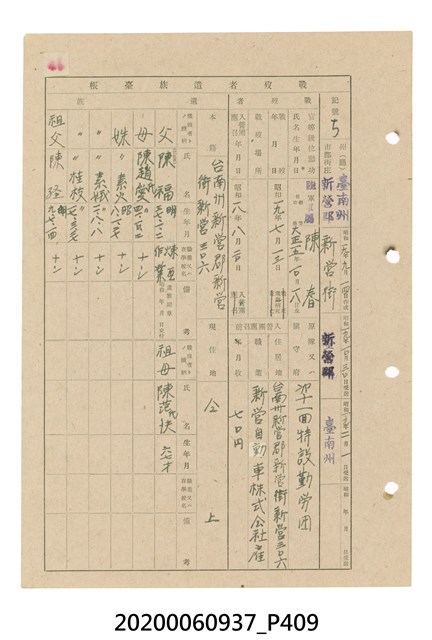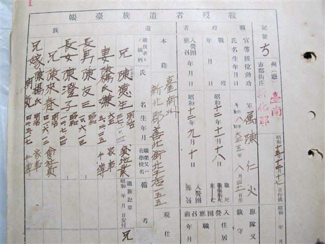 1.本件長19.1公分、寬27.5公分、高4.3公分。本件臺帳登記了戰歿者、軍隊隊號、所屬州郡、製作日期、軍階、應召入軍隊的時間、戰歿時間、死亡原因、本籍居住地、遺族、親戚關係、遺族之個人資料(含出生年月日、職業等)。 2.本件戰歿者名為陳仁火,1916年8月31日生,為軍隊ち號,軍階為軍屬,來自臺南州新化郡,入團時間為1937年9月10日,死亡原因為戰死,戰歿時間為1937年11月18日。本件作成時間為1940年12月17日。遺族包含兩位哥哥(陳德生、陳來春)、一位嫂嫂(陳楊明氣)、妻子(陳楊嫌)與一對兒女(長男陳有三、長女陳澄子)。3.臺帳指的是登記某種事實的帳簿或書冊,例如:土地臺帳;而本件為登記戰歿者及其遺族的相關資料書冊。