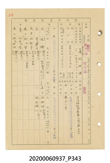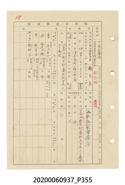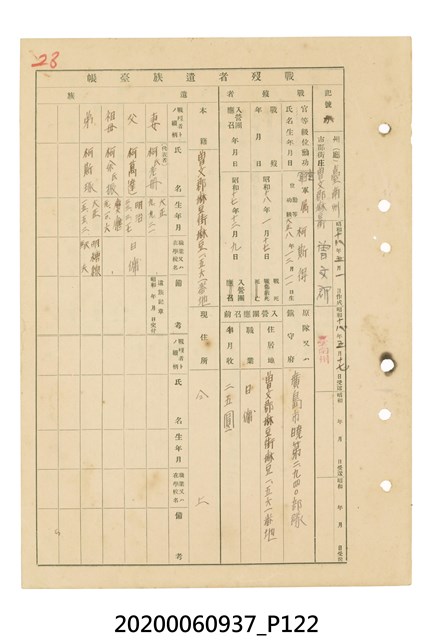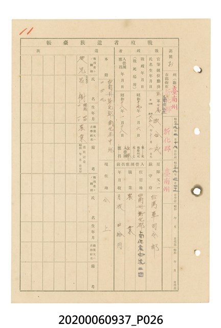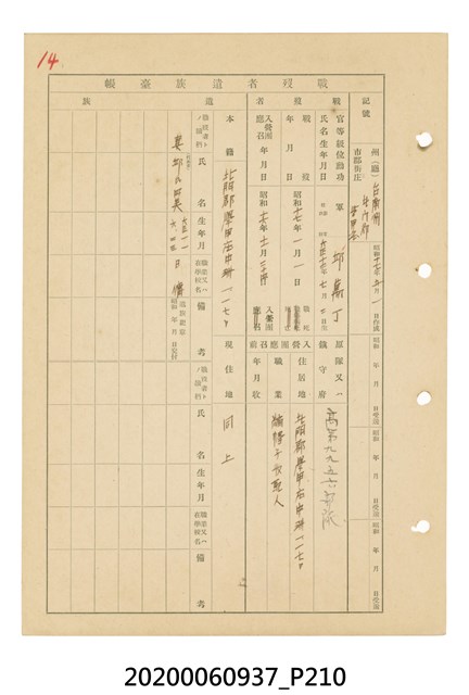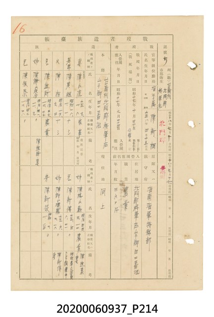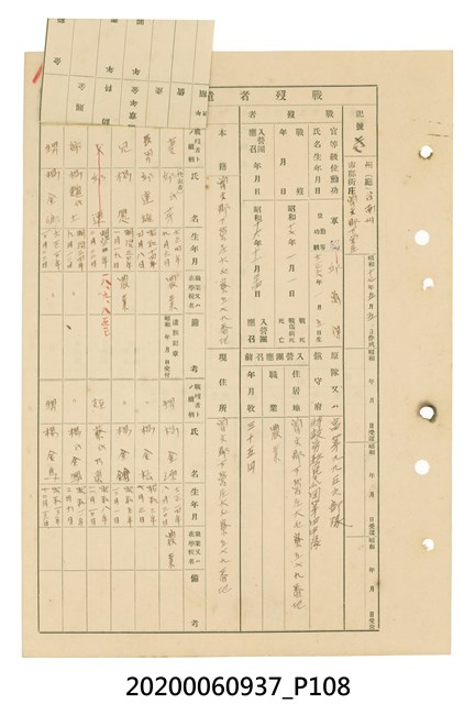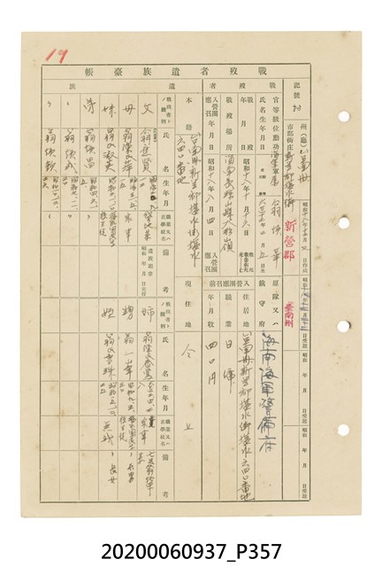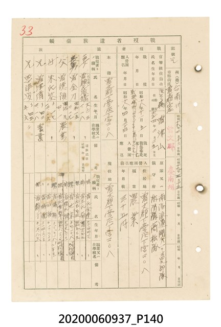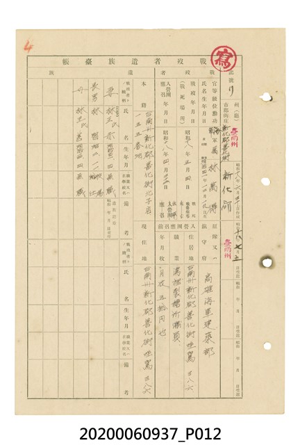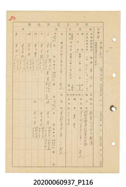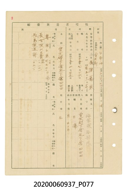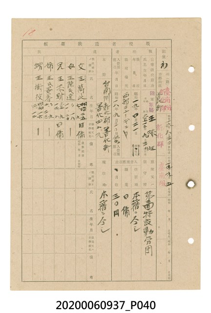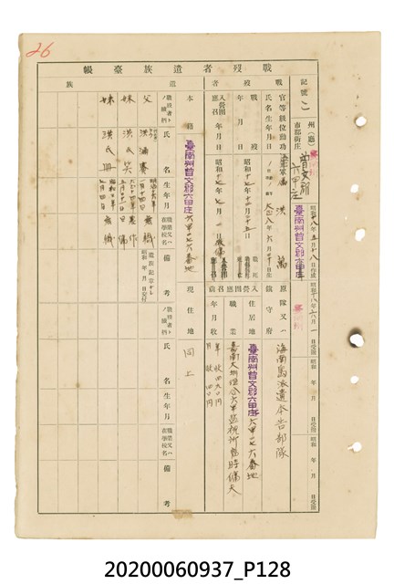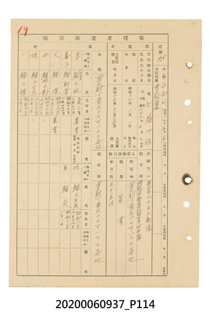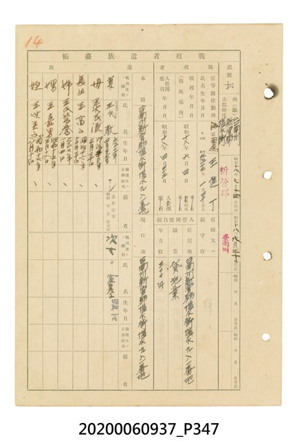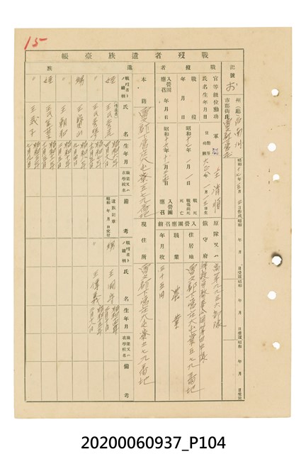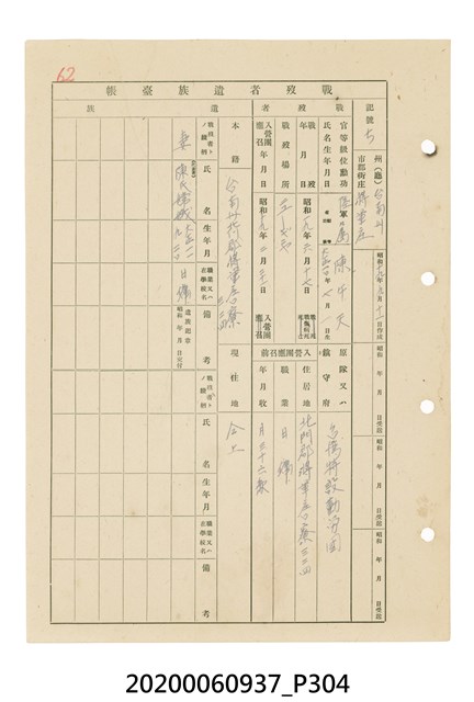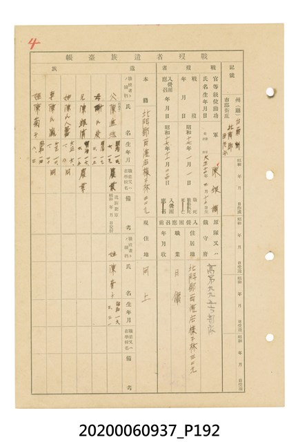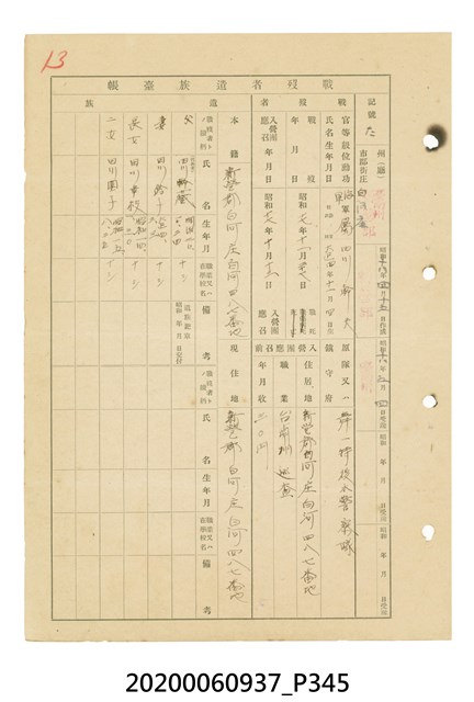 1.本件長19.1公分、寬27.5公分、高4.3公分。本件臺帳登記了戰歿者、軍隊隊號、所屬州郡、製作日期、軍階、應召入軍隊的時間、戰歿時間、死亡原因、本籍居住地、遺族、親戚關係、遺族之個人資料(含出生年月日、職業等)。 2.本件戰歿者名為陳仁火,1916年8月31日生,為軍隊ち號,軍階為軍屬,來自臺南州新化郡,入團時間為1937年9月10日,死亡原因為戰死,戰歿時間為1937年11月18日。本件作成時間為1940年12月17日。遺族包含兩位哥哥(陳德生、陳來春)、一位嫂嫂(陳楊明氣)、妻子(陳楊嫌)與一對兒女(長男陳有三、長女陳澄子)。3.臺帳指的是登記某種事實的帳簿或書冊,例如:土地臺帳;而本件為登記戰歿者及其遺族的相關資料書冊。