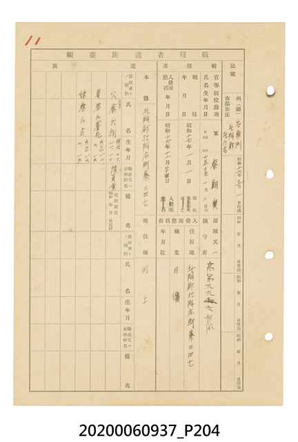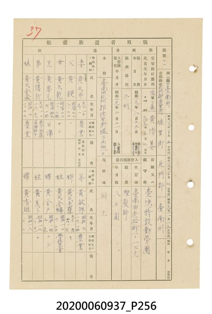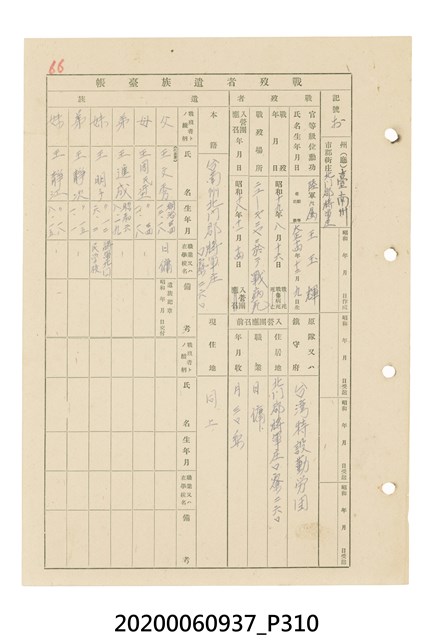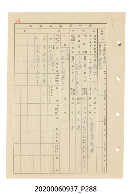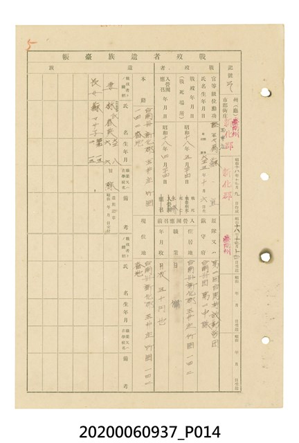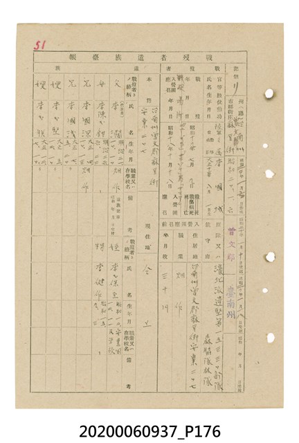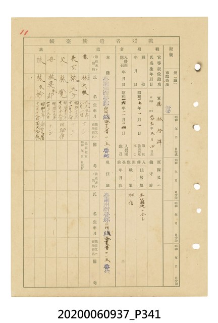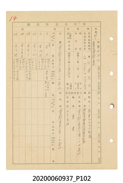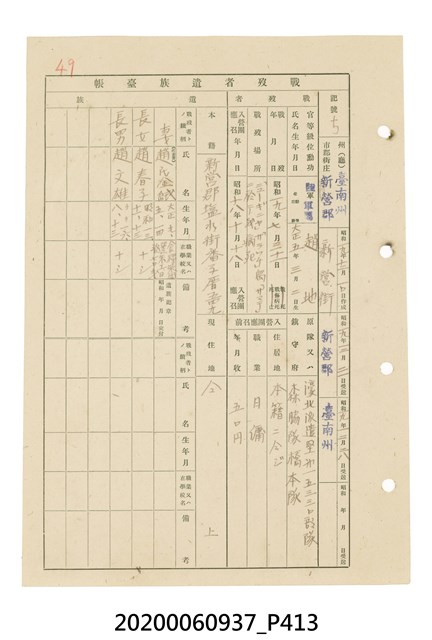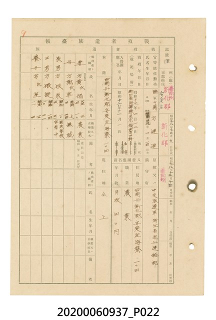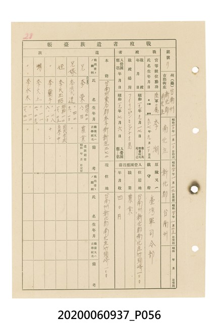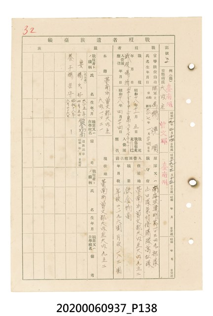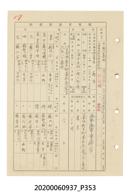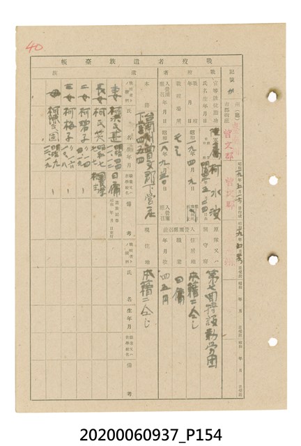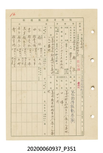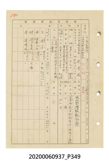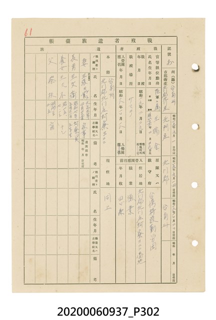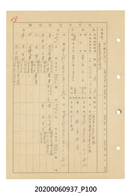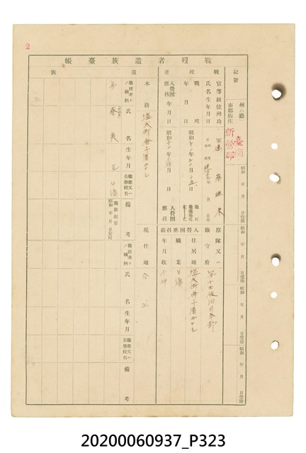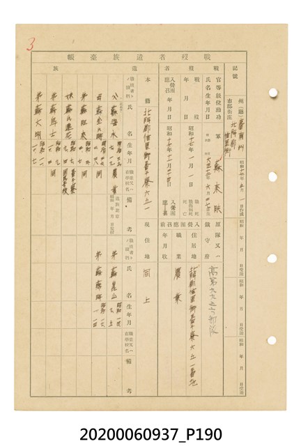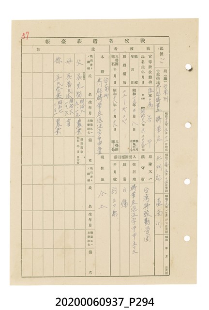 1.本件長19.1公分、寬27.5公分、高4.3公分。本件臺帳登記了戰歿者、軍隊隊號、所屬州郡、製作日期、軍階、應召入軍隊的時間、戰歿時間、死亡原因、本籍居住地、遺族、親戚關係、遺族之個人資料(含出生年月日、職業等)。 2.本件戰歿者名為陳仁火,1916年8月31日生,為軍隊ち號,軍階為軍屬,來自臺南州新化郡,入團時間為1937年9月10日,死亡原因為戰死,戰歿時間為1937年11月18日。本件作成時間為1940年12月17日。遺族包含兩位哥哥(陳德生、陳來春)、一位嫂嫂(陳楊明氣)、妻子(陳楊嫌)與一對兒女(長男陳有三、長女陳澄子)。3.臺帳指的是登記某種事實的帳簿或書冊,例如:土地臺帳;而本件為登記戰歿者及其遺族的相關資料書冊。