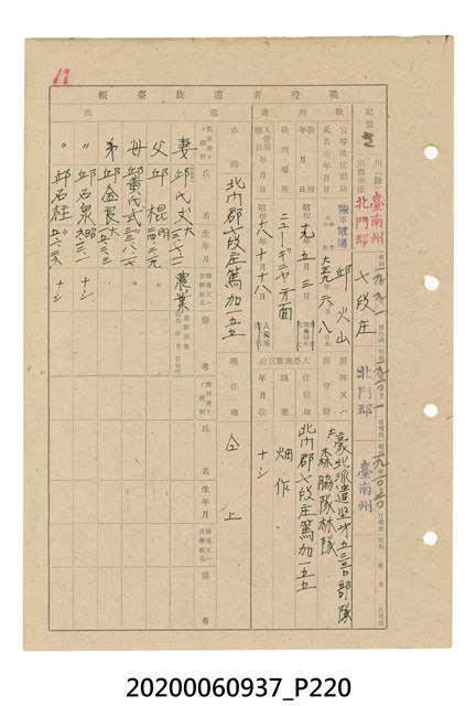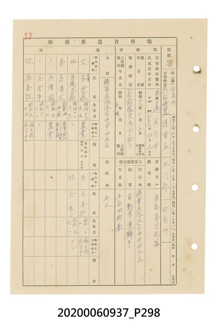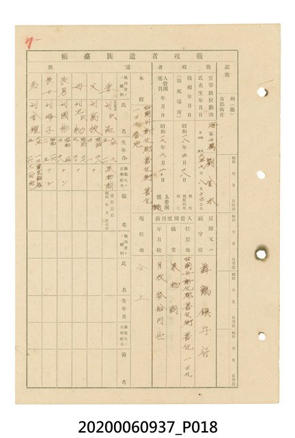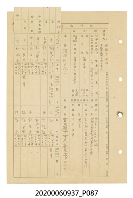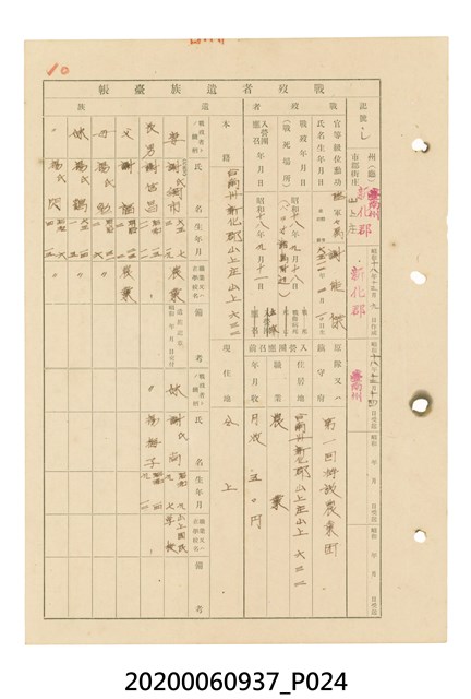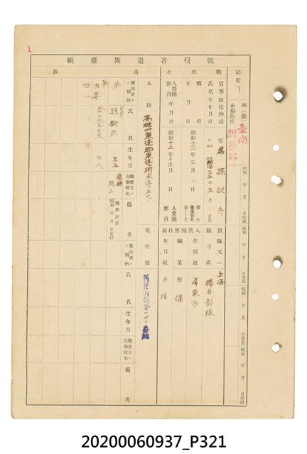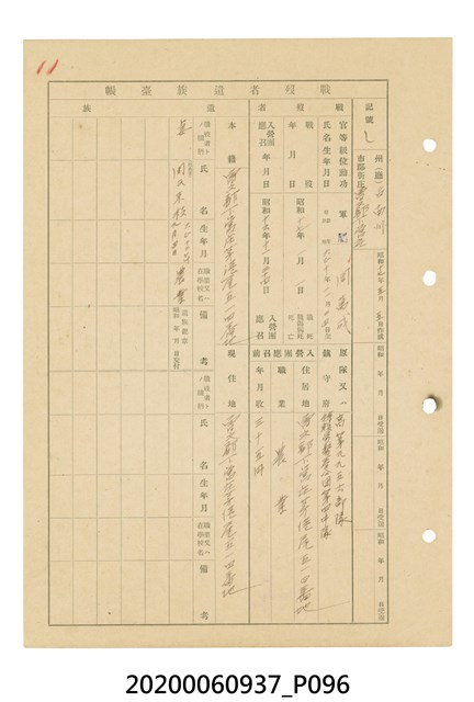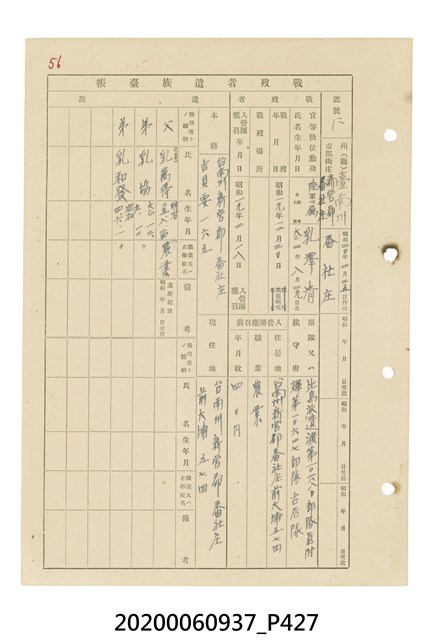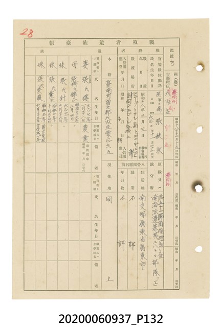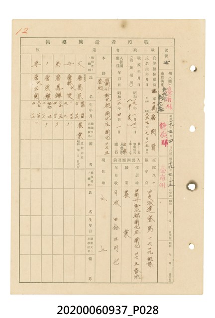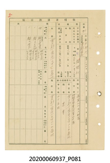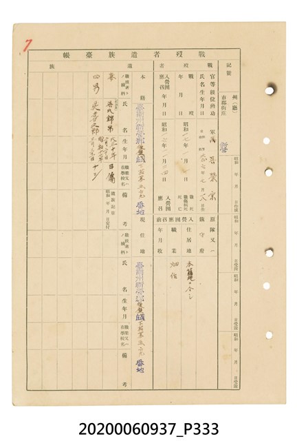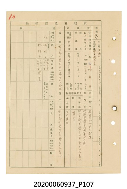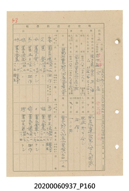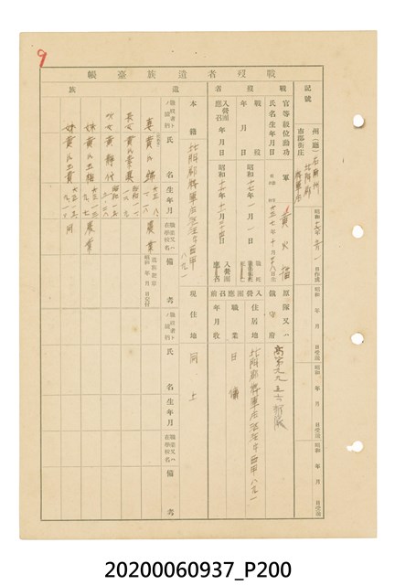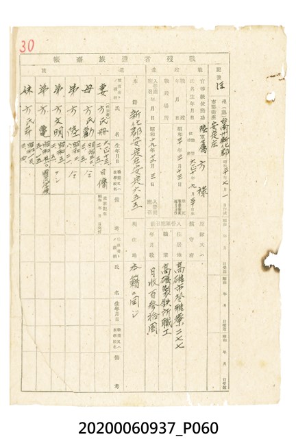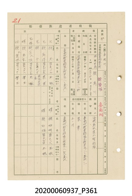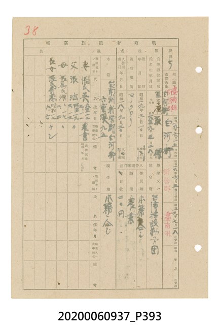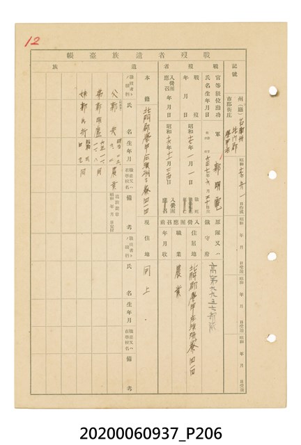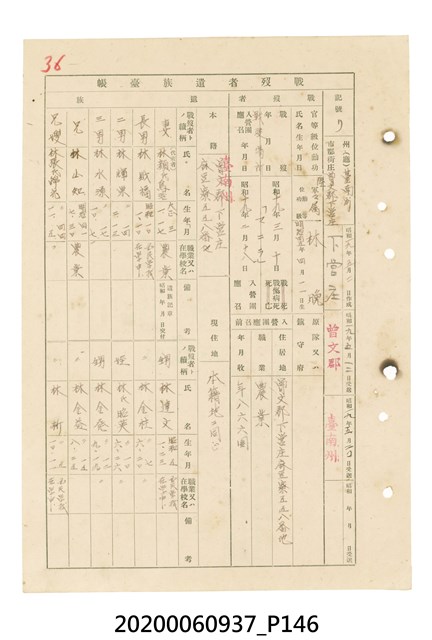 1.本件長19.1公分、寬27.5公分、高4.3公分。本件臺帳登記了戰歿者、軍隊隊號、所屬州郡、製作日期、軍階、應召入軍隊的時間、戰歿時間、死亡原因、本籍居住地、遺族、親戚關係、遺族之個人資料(含出生年月日、職業等)。 2.本件戰歿者名為陳仁火,1916年8月31日生,為軍隊ち號,軍階為軍屬,來自臺南州新化郡,入團時間為1937年9月10日,死亡原因為戰死,戰歿時間為1937年11月18日。本件作成時間為1940年12月17日。遺族包含兩位哥哥(陳德生、陳來春)、一位嫂嫂(陳楊明氣)、妻子(陳楊嫌)與一對兒女(長男陳有三、長女陳澄子)。3.臺帳指的是登記某種事實的帳簿或書冊,例如:土地臺帳;而本件為登記戰歿者及其遺族的相關資料書冊。