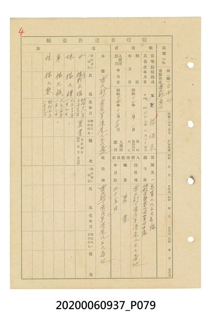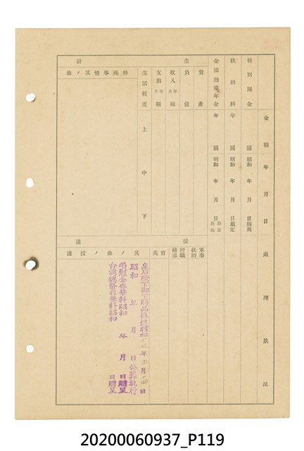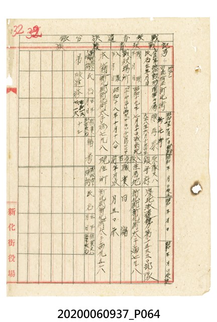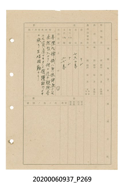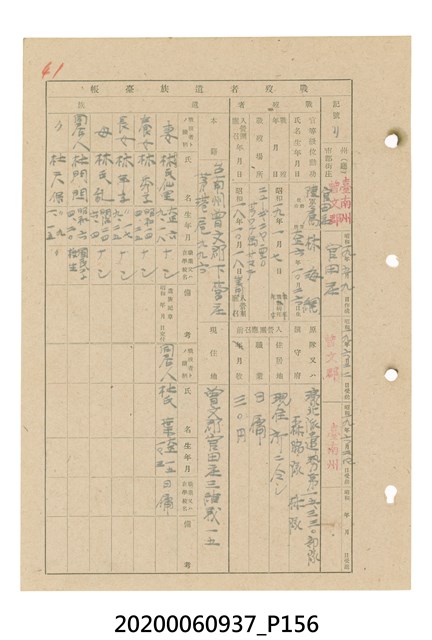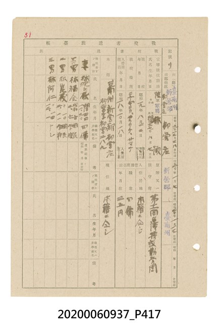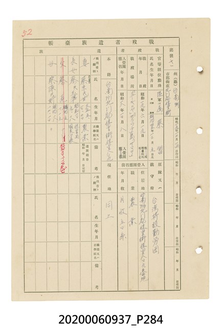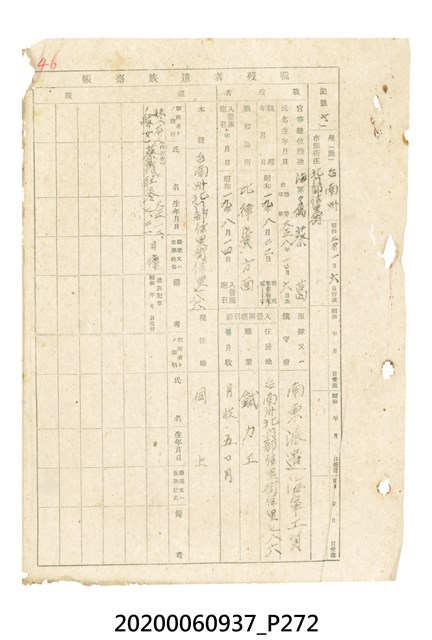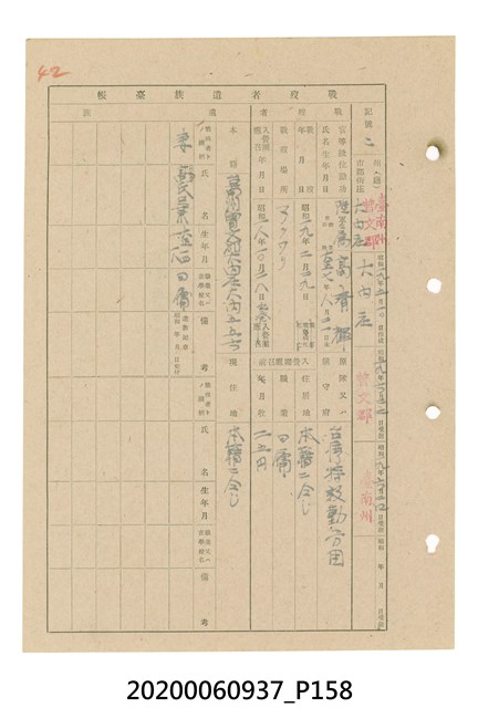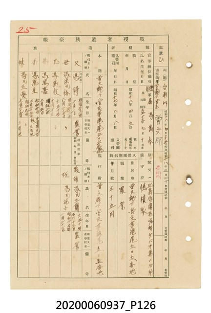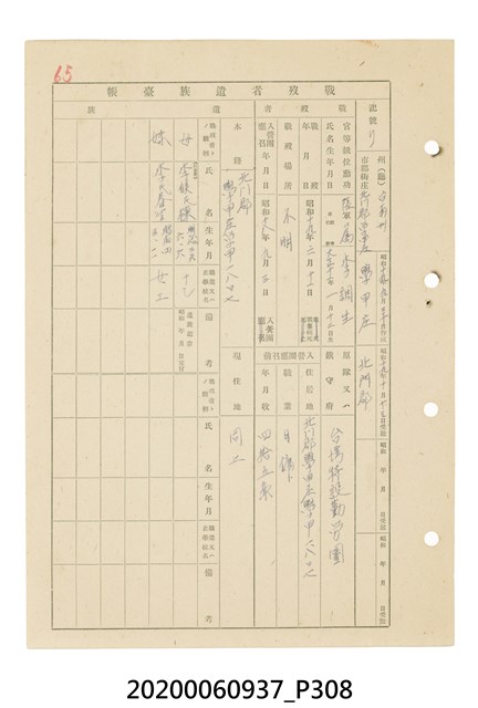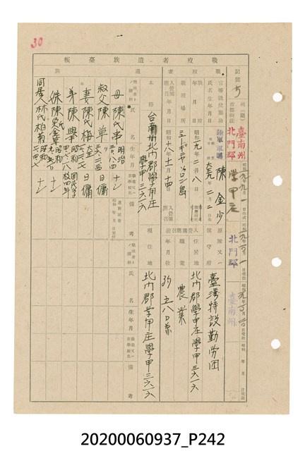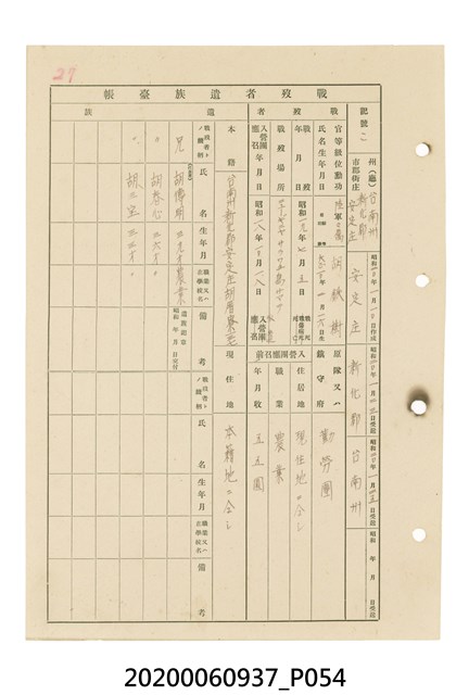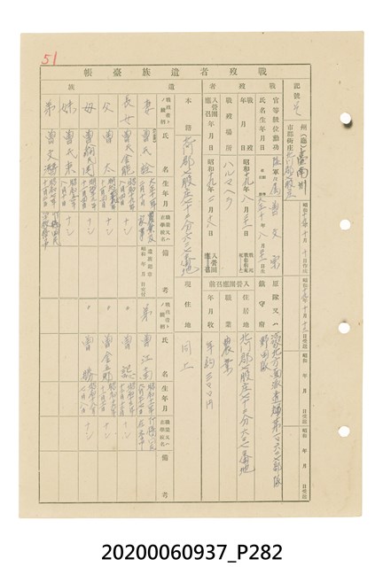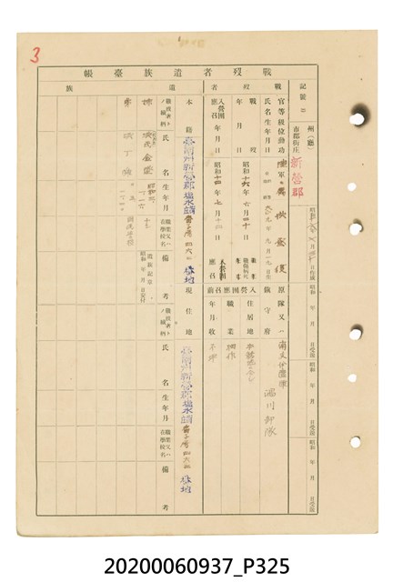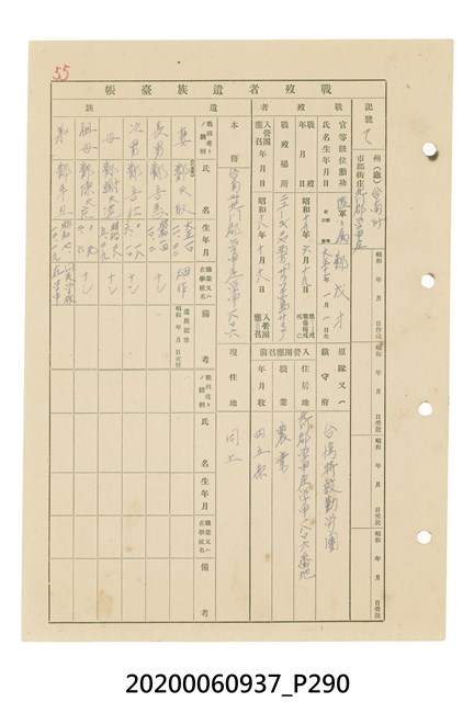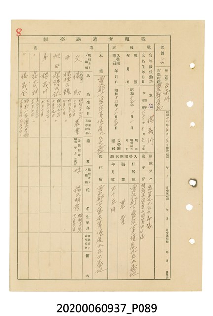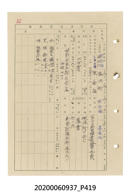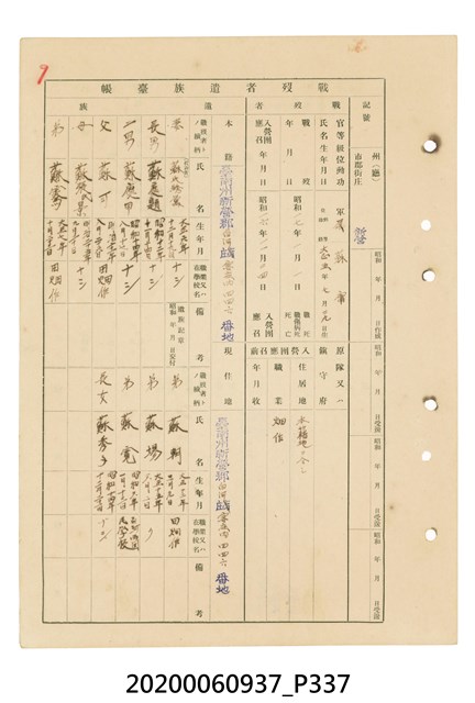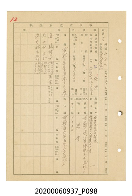 1.本件長19.1公分、寬27.5公分、高4.3公分。本件臺帳登記了戰歿者、軍隊隊號、所屬州郡、製作日期、軍階、應召入軍隊的時間、戰歿時間、死亡原因、本籍居住地、遺族、親戚關係、遺族之個人資料(含出生年月日、職業等)。 2.本件戰歿者名為陳仁火,1916年8月31日生,為軍隊ち號,軍階為軍屬,來自臺南州新化郡,入團時間為1937年9月10日,死亡原因為戰死,戰歿時間為1937年11月18日。本件作成時間為1940年12月17日。遺族包含兩位哥哥(陳德生、陳來春)、一位嫂嫂(陳楊明氣)、妻子(陳楊嫌)與一對兒女(長男陳有三、長女陳澄子)。3.臺帳指的是登記某種事實的帳簿或書冊,例如:土地臺帳;而本件為登記戰歿者及其遺族的相關資料書冊。