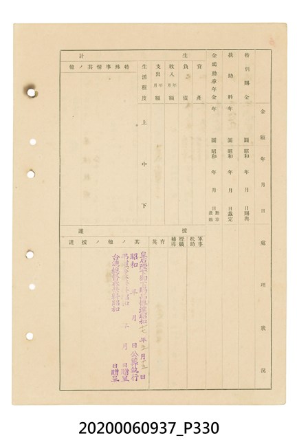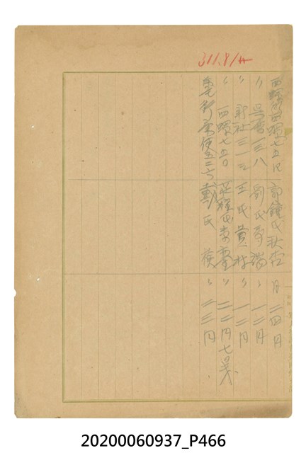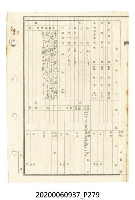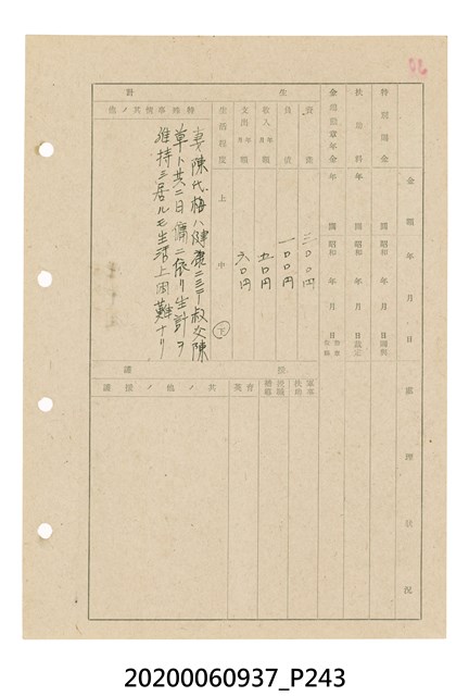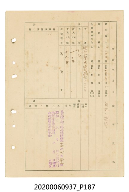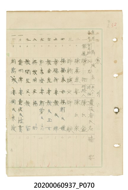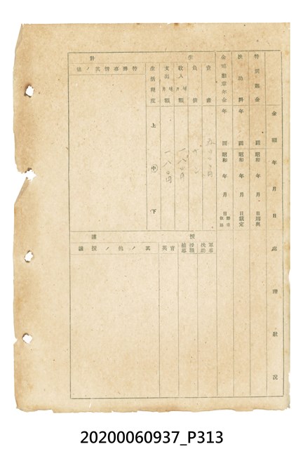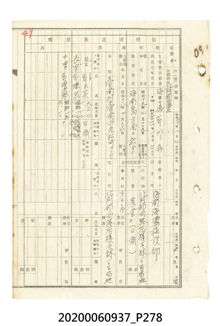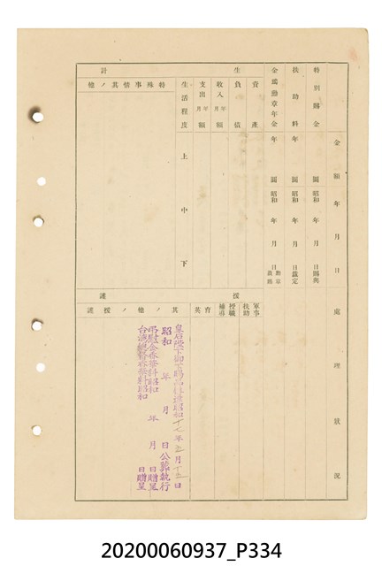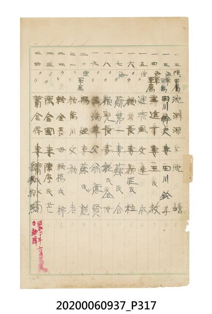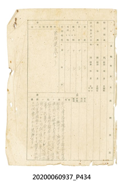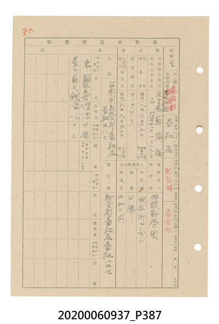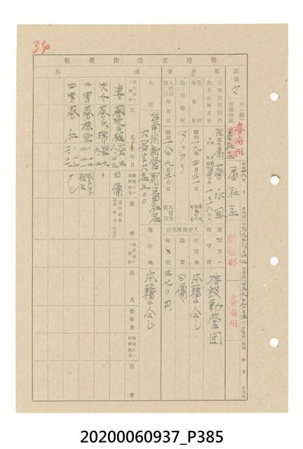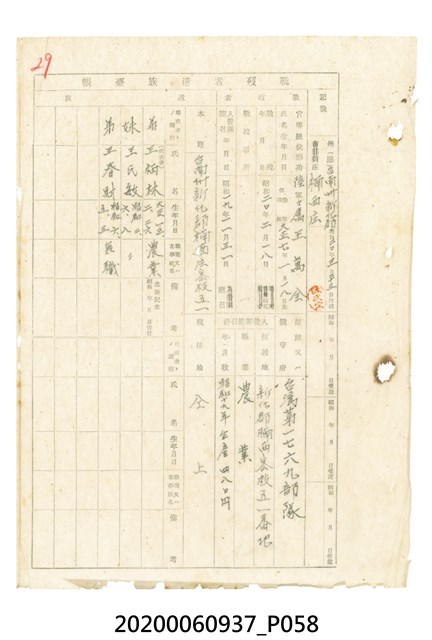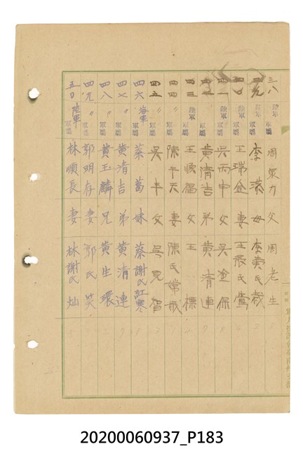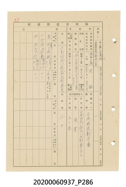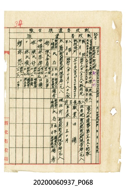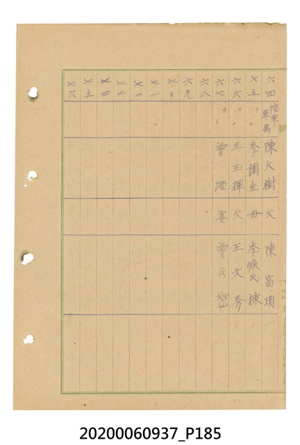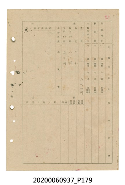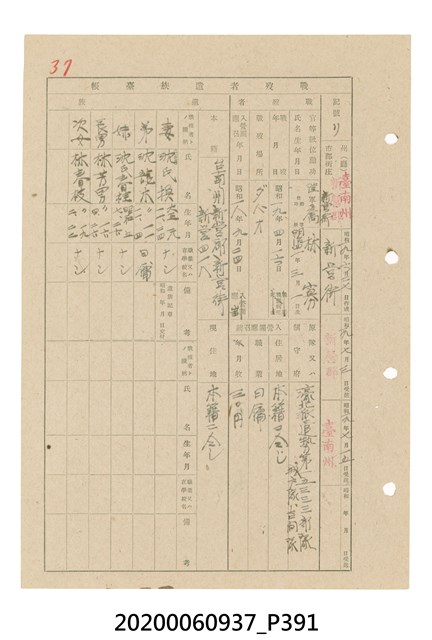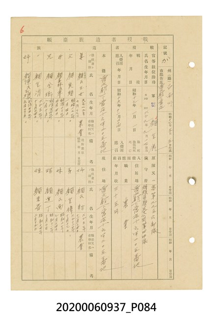 1.本件長19.1公分、寬27.5公分、高4.3公分。本件臺帳登記了戰歿者、軍隊隊號、所屬州郡、製作日期、軍階、應召入軍隊的時間、戰歿時間、死亡原因、本籍居住地、遺族、親戚關係、遺族之個人資料(含出生年月日、職業等)。 2.本件戰歿者名為陳仁火,1916年8月31日生,為軍隊ち號,軍階為軍屬,來自臺南州新化郡,入團時間為1937年9月10日,死亡原因為戰死,戰歿時間為1937年11月18日。本件作成時間為1940年12月17日。遺族包含兩位哥哥(陳德生、陳來春)、一位嫂嫂(陳楊明氣)、妻子(陳楊嫌)與一對兒女(長男陳有三、長女陳澄子)。3.臺帳指的是登記某種事實的帳簿或書冊,例如:土地臺帳;而本件為登記戰歿者及其遺族的相關資料書冊。