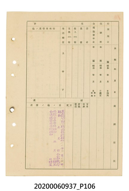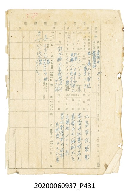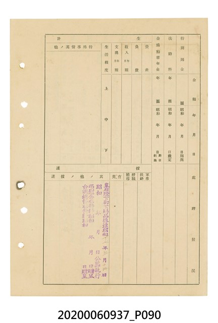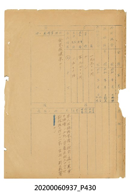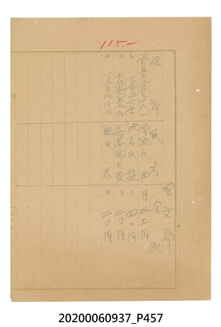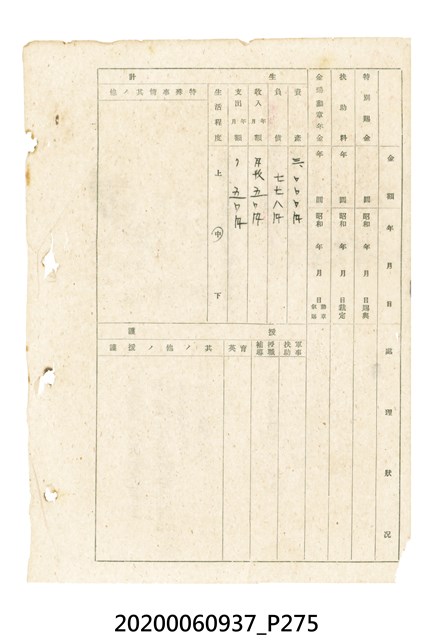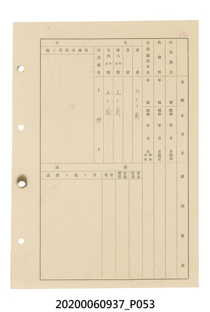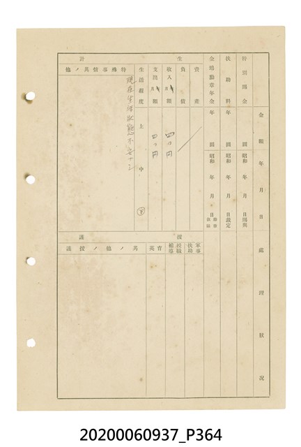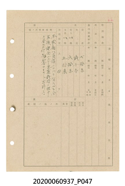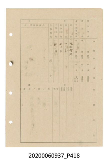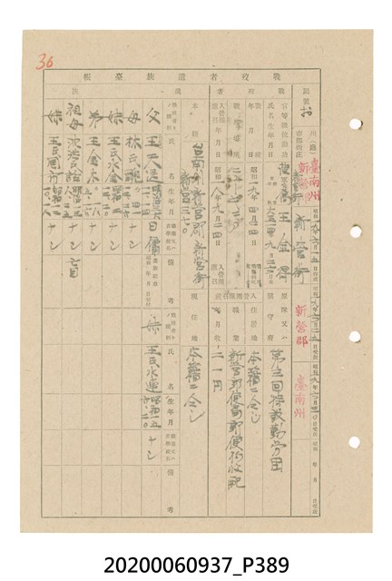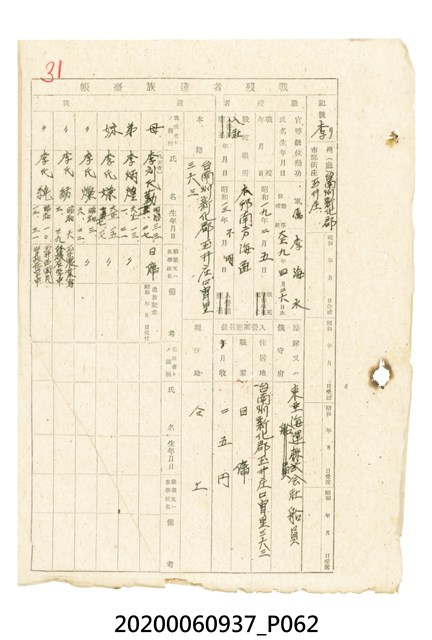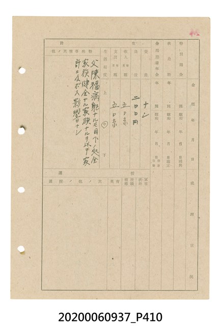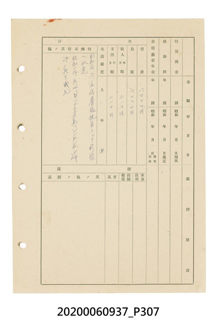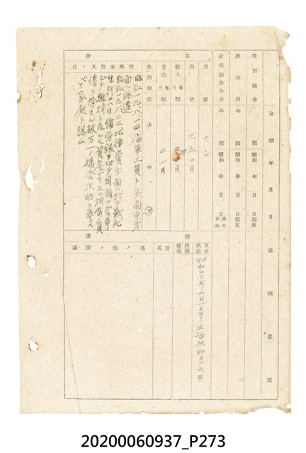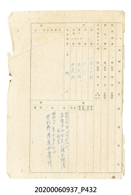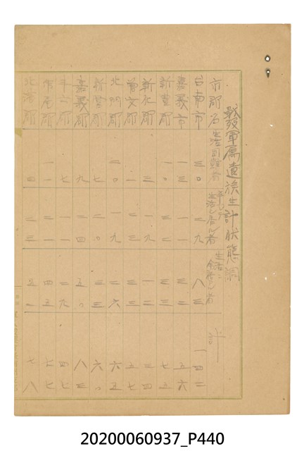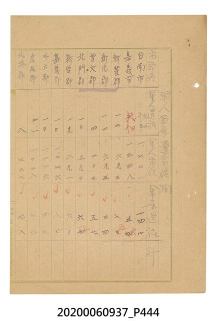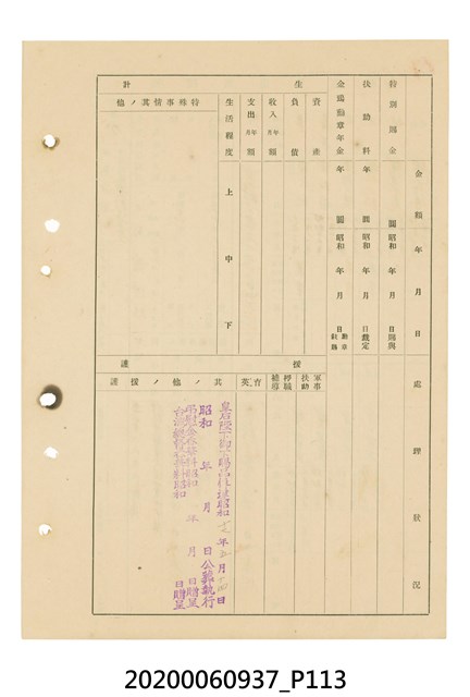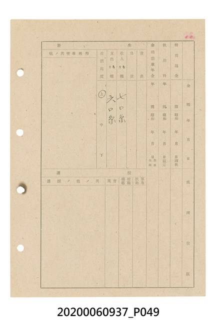 1.本件長19.1公分、寬27.5公分、高4.3公分。本件臺帳登記了戰歿者、軍隊隊號、所屬州郡、製作日期、軍階、應召入軍隊的時間、戰歿時間、死亡原因、本籍居住地、遺族、親戚關係、遺族之個人資料(含出生年月日、職業等)。 2.本件戰歿者名為陳仁火,1916年8月31日生,為軍隊ち號,軍階為軍屬,來自臺南州新化郡,入團時間為1937年9月10日,死亡原因為戰死,戰歿時間為1937年11月18日。本件作成時間為1940年12月17日。遺族包含兩位哥哥(陳德生、陳來春)、一位嫂嫂(陳楊明氣)、妻子(陳楊嫌)與一對兒女(長男陳有三、長女陳澄子)。3.臺帳指的是登記某種事實的帳簿或書冊,例如:土地臺帳;而本件為登記戰歿者及其遺族的相關資料書冊。