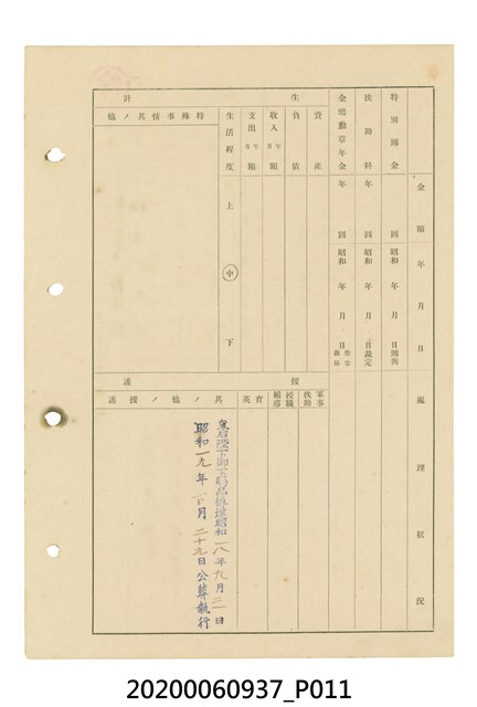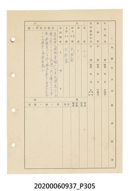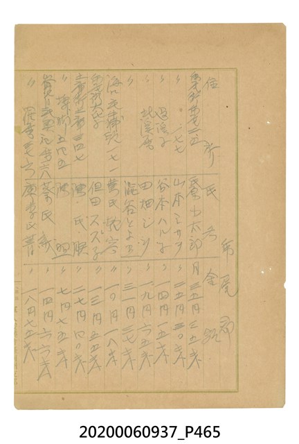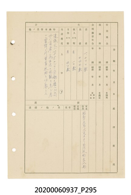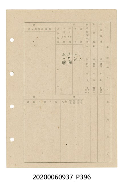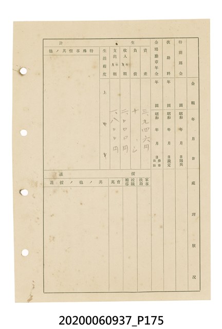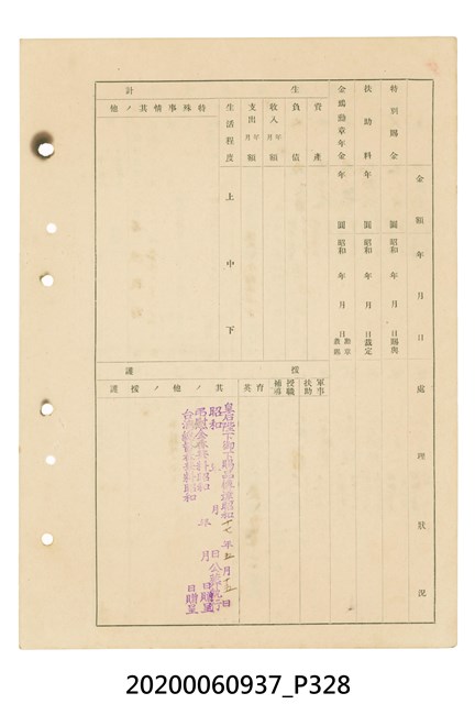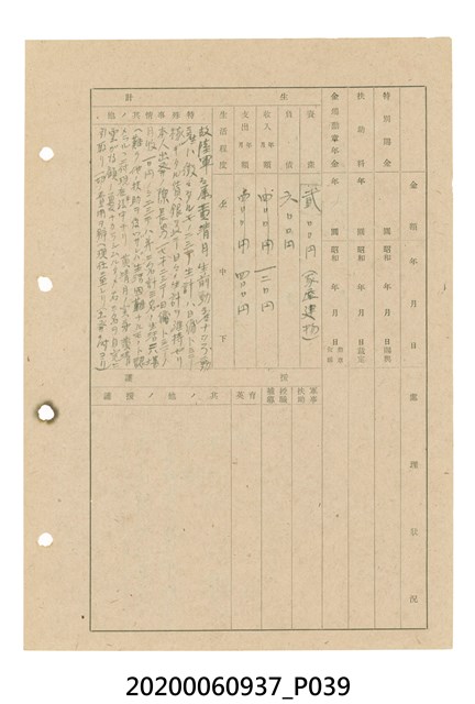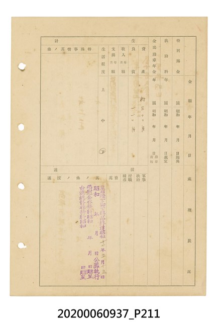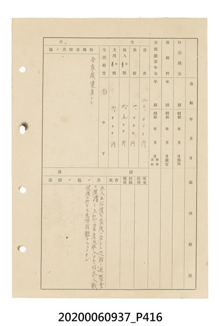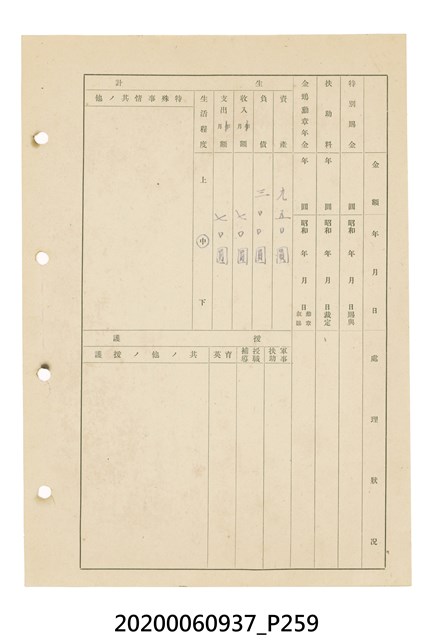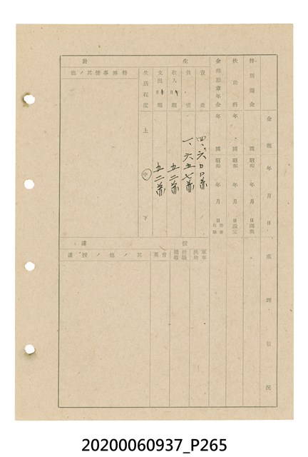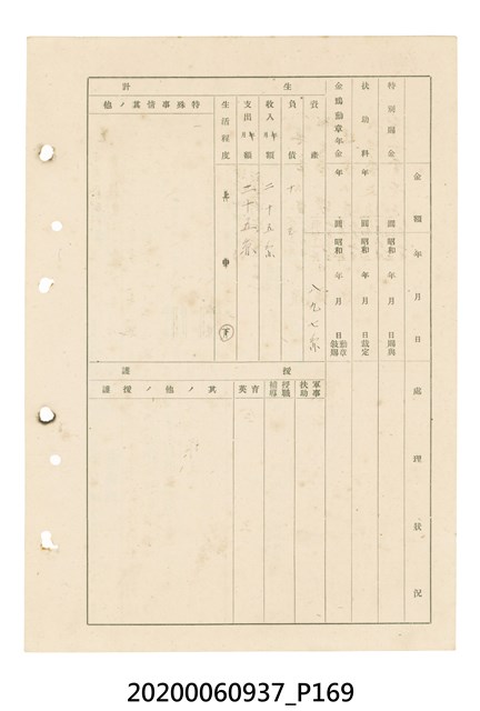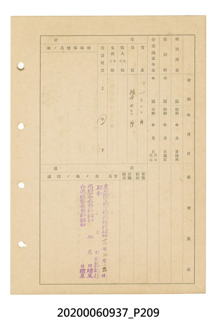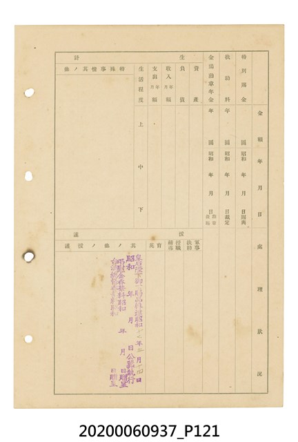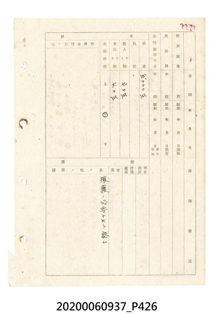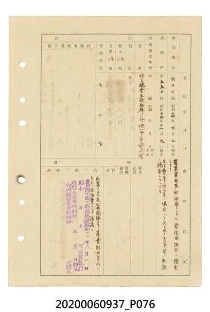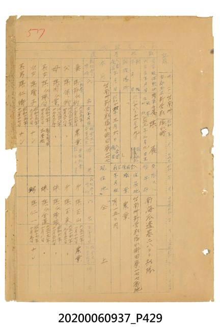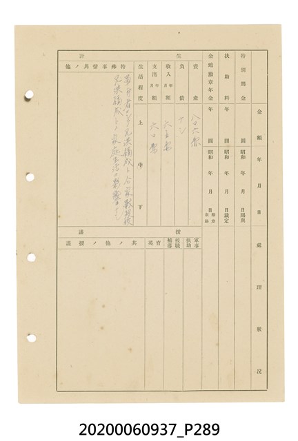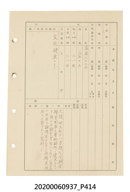 1.本件長19.1公分、寬27.5公分、高4.3公分。本件臺帳登記了戰歿者、軍隊隊號、所屬州郡、製作日期、軍階、應召入軍隊的時間、戰歿時間、死亡原因、本籍居住地、遺族、親戚關係、遺族之個人資料(含出生年月日、職業等)。 2.本件戰歿者名為陳仁火,1916年8月31日生,為軍隊ち號,軍階為軍屬,來自臺南州新化郡,入團時間為1937年9月10日,死亡原因為戰死,戰歿時間為1937年11月18日。本件作成時間為1940年12月17日。遺族包含兩位哥哥(陳德生、陳來春)、一位嫂嫂(陳楊明氣)、妻子(陳楊嫌)與一對兒女(長男陳有三、長女陳澄子)。3.臺帳指的是登記某種事實的帳簿或書冊,例如:土地臺帳;而本件為登記戰歿者及其遺族的相關資料書冊。