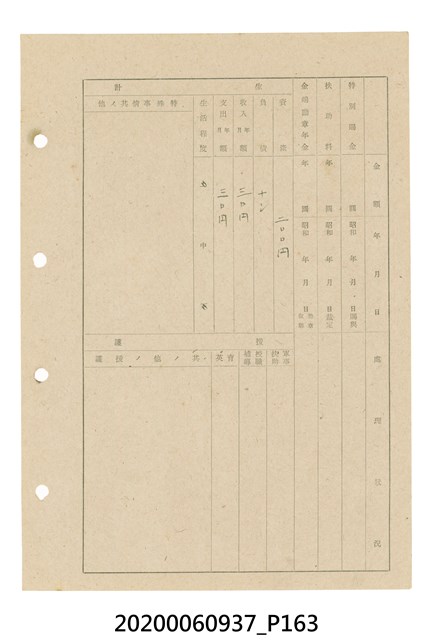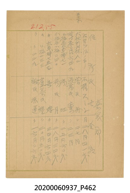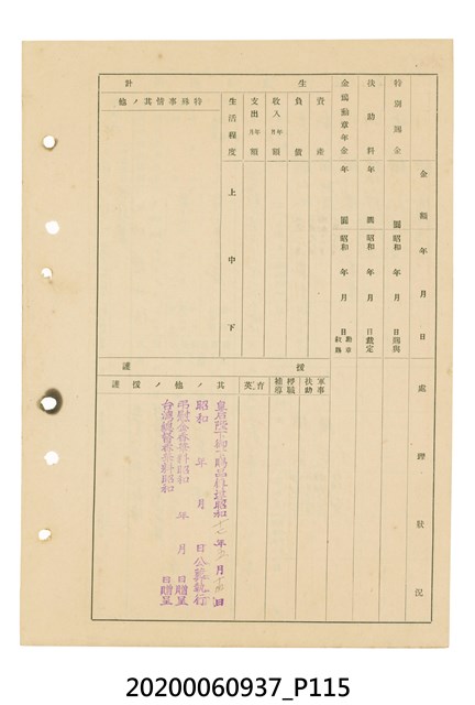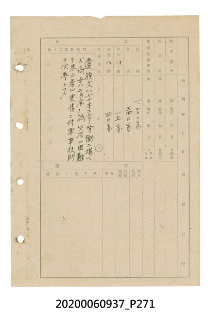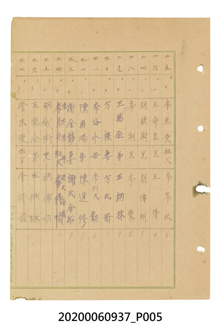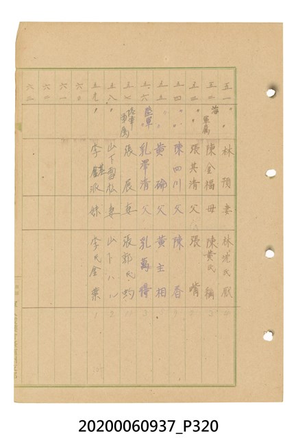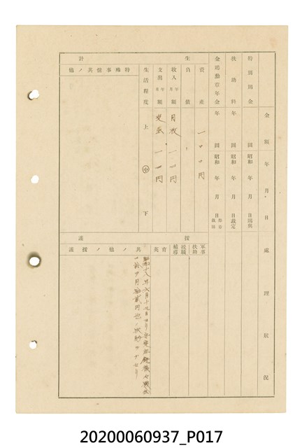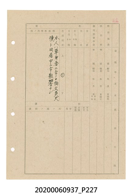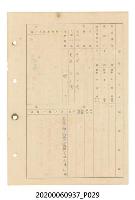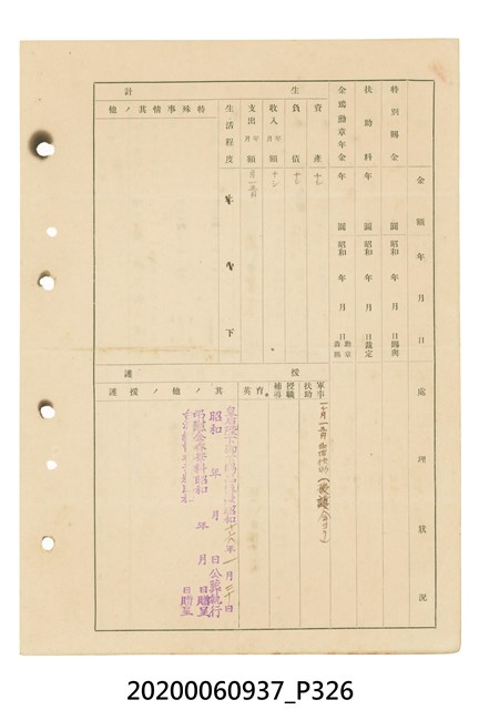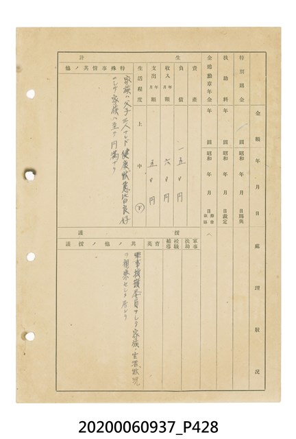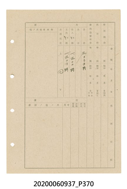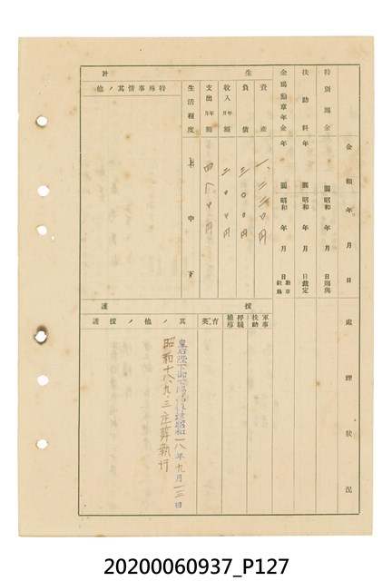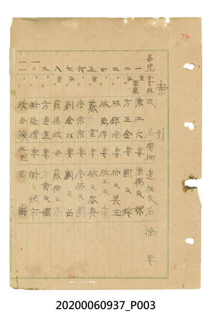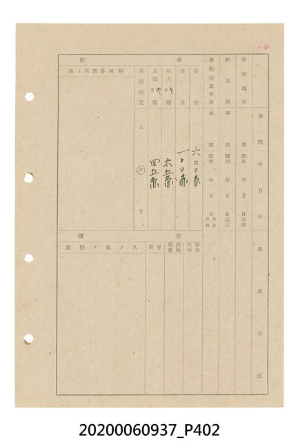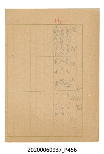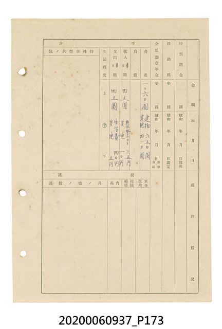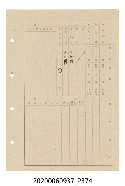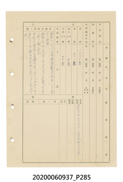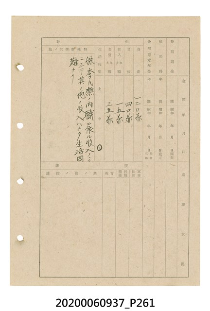 1.本件長19.1公分、寬27.5公分、高4.3公分。本件臺帳登記了戰歿者、軍隊隊號、所屬州郡、製作日期、軍階、應召入軍隊的時間、戰歿時間、死亡原因、本籍居住地、遺族、親戚關係、遺族之個人資料(含出生年月日、職業等)。 2.本件戰歿者名為陳仁火,1916年8月31日生,為軍隊ち號,軍階為軍屬,來自臺南州新化郡,入團時間為1937年9月10日,死亡原因為戰死,戰歿時間為1937年11月18日。本件作成時間為1940年12月17日。遺族包含兩位哥哥(陳德生、陳來春)、一位嫂嫂(陳楊明氣)、妻子(陳楊嫌)與一對兒女(長男陳有三、長女陳澄子)。3.臺帳指的是登記某種事實的帳簿或書冊,例如:土地臺帳;而本件為登記戰歿者及其遺族的相關資料書冊。
