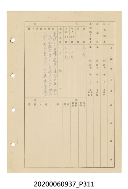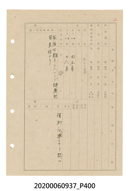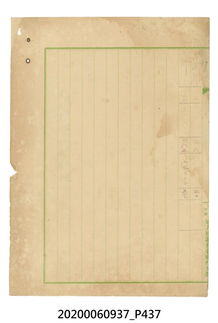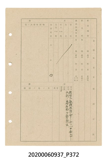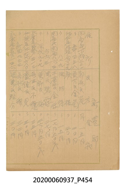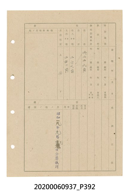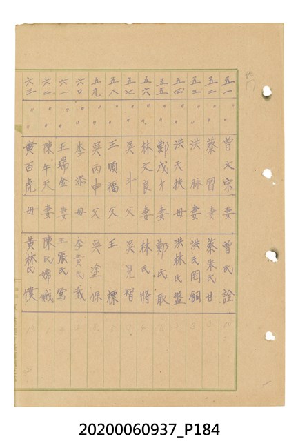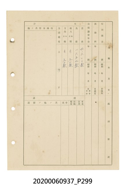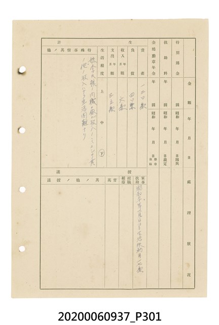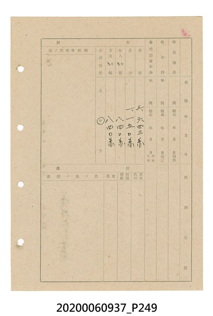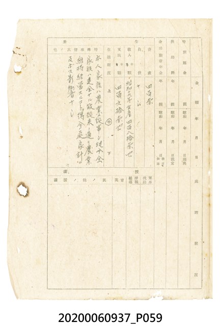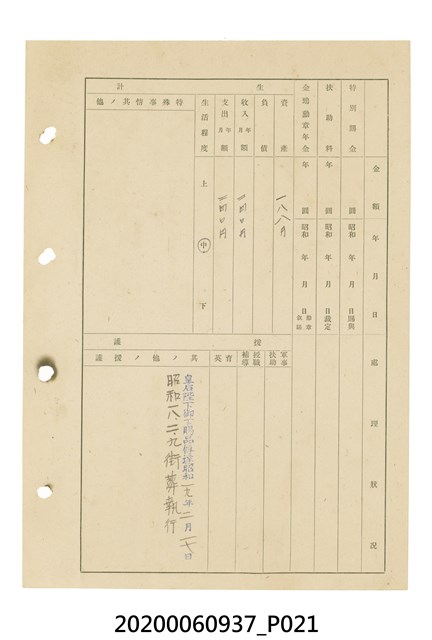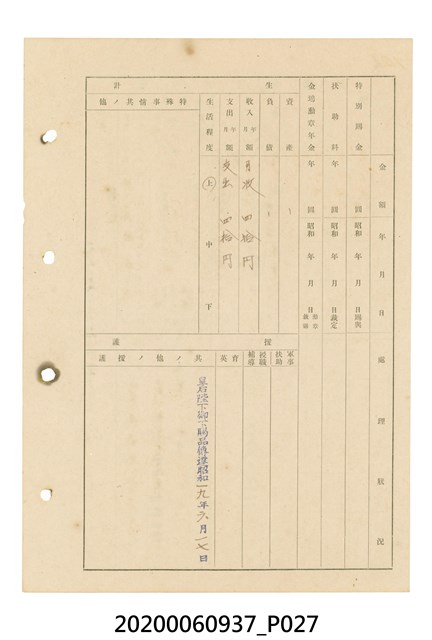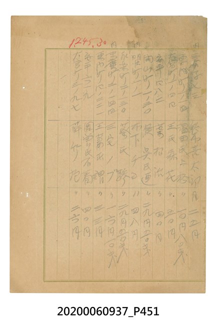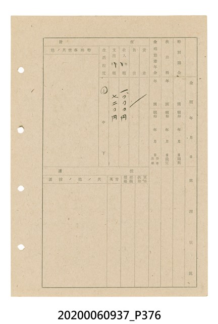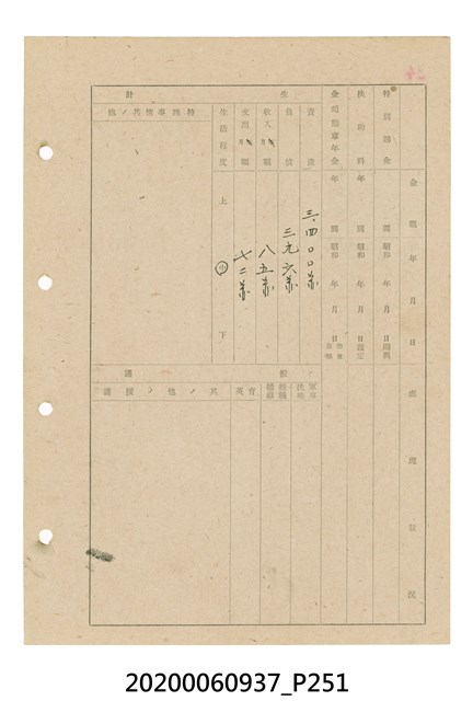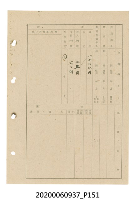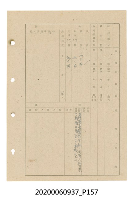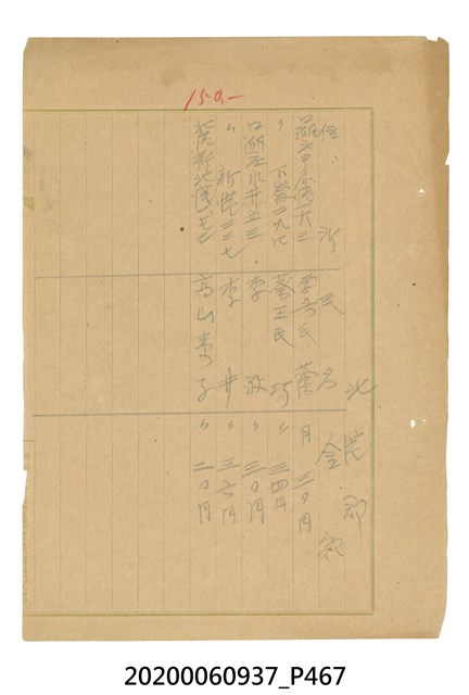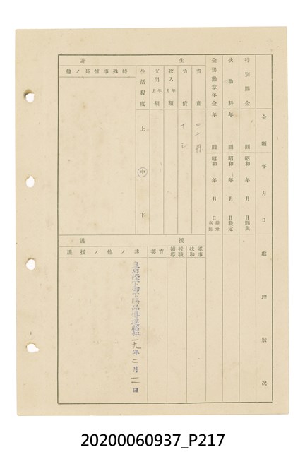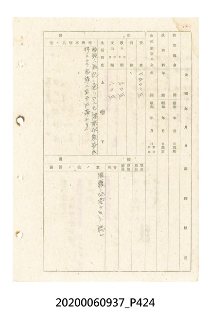 1.本件長19.1公分、寬27.5公分、高4.3公分。本件臺帳登記了戰歿者、軍隊隊號、所屬州郡、製作日期、軍階、應召入軍隊的時間、戰歿時間、死亡原因、本籍居住地、遺族、親戚關係、遺族之個人資料(含出生年月日、職業等)。 2.本件戰歿者名為陳仁火,1916年8月31日生,為軍隊ち號,軍階為軍屬,來自臺南州新化郡,入團時間為1937年9月10日,死亡原因為戰死,戰歿時間為1937年11月18日。本件作成時間為1940年12月17日。遺族包含兩位哥哥(陳德生、陳來春)、一位嫂嫂(陳楊明氣)、妻子(陳楊嫌)與一對兒女(長男陳有三、長女陳澄子)。3.臺帳指的是登記某種事實的帳簿或書冊,例如:土地臺帳;而本件為登記戰歿者及其遺族的相關資料書冊。