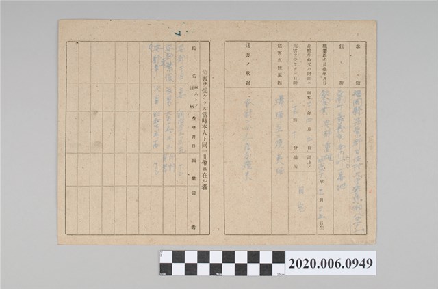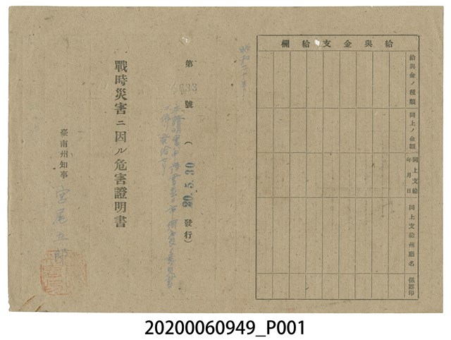本件長19公分、寬26公分、高0.1公分。為戰時造成之意外災害證明書,為昭和20年(1945)5月30日發行,經手人為臺南州知事宮尾五郎,後方附上文件為個案證明書,包含受害者之籍貫、住所、危害狀況、給付金等相關資料。