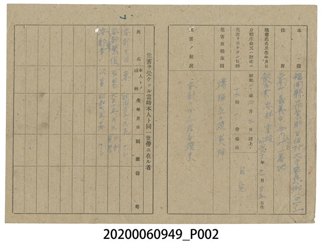 戰時造成的意外災害證明書第8633號(昭和20年5月30日發行)