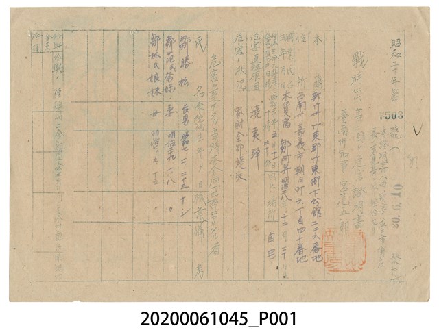 戰時造成的意外災害證明書第7503號(昭和20年6月10日發行)