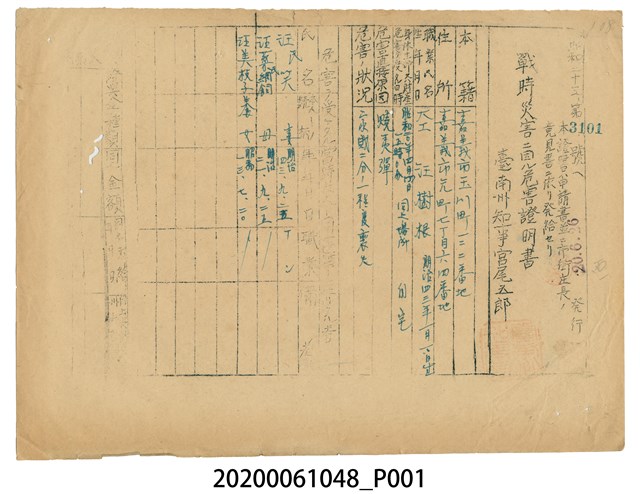 戰時造成的意外災害證明書第3101號(昭和20年6月26日發行)