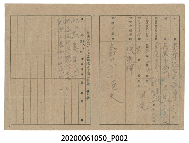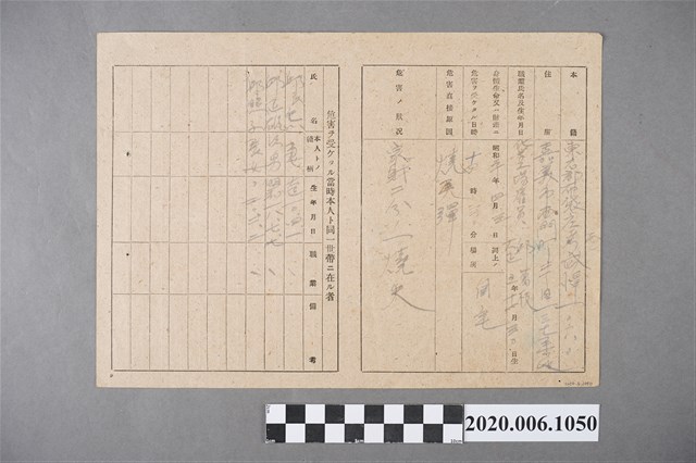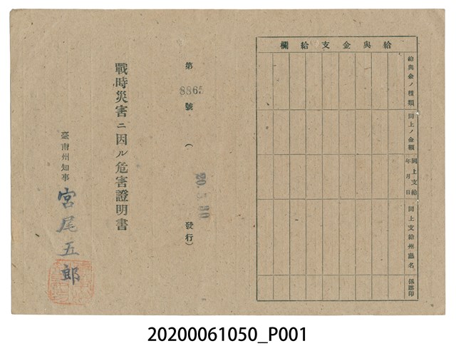 戰時造成的意外災害證明書第8865號(昭和20年5月30日發行)