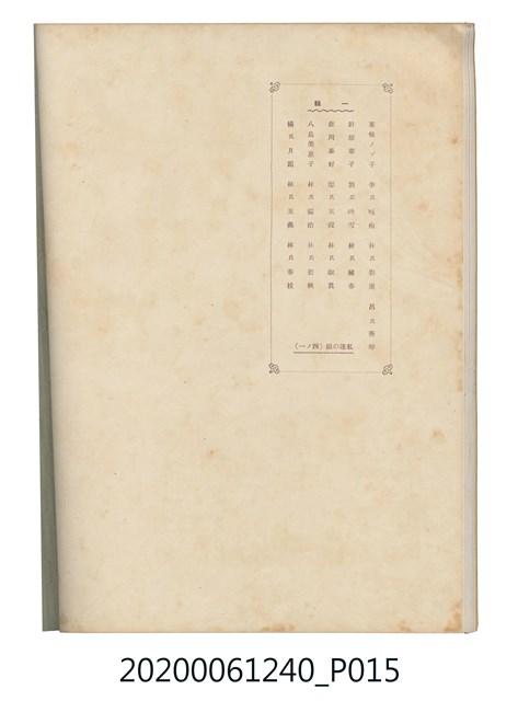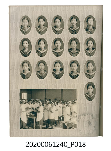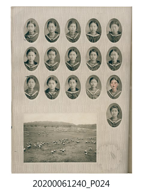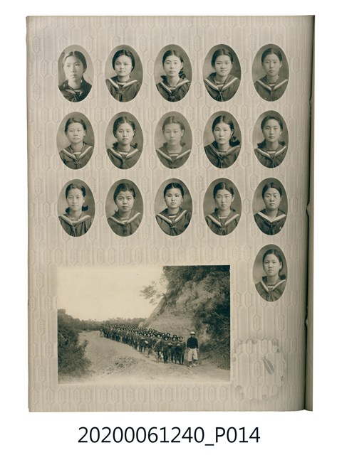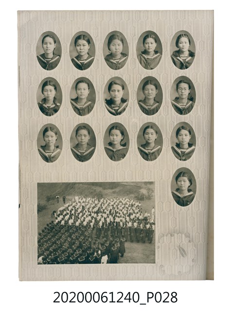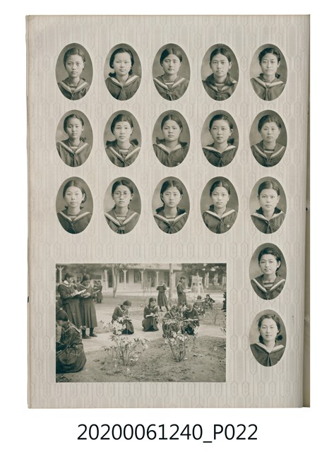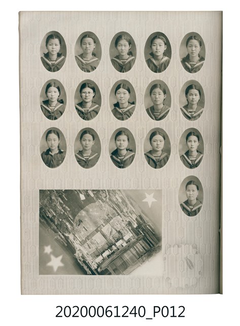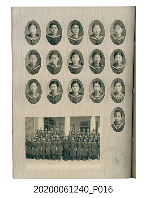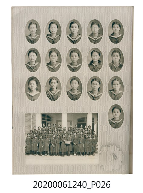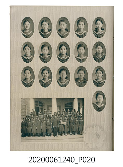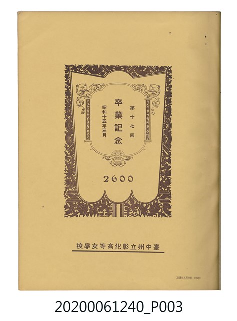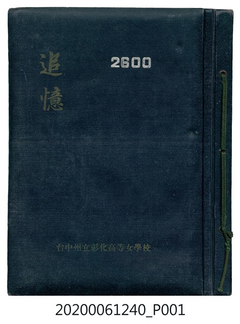 1.本物件為臺中州立彰化高等女學校畢業紀念冊。採直式印刷,封面、封底皆為深藍色,硬殼線裝;封面左上角有「追憶」字樣,上半部有「2600」,意指皇紀2600年,即1940年。下半部有「台中州立彰化高等女學校卒業」字樣。內頁封面印有幾何圖案,方框內有「第十七回卒業記念 昭和十五年三月 2600」字樣,下半部印「臺中州立彰化高等女學校」;右下角有「彰化市 柴田寫真館謹製」小字。內頁收錄的照片,包括校長及各教師、校門、校舍、升旗典禮、宿舍、校內神社地鎮祭及各種校園生活照;最末頁為通訊頁,上載教職員及畢業生姓名和住址。