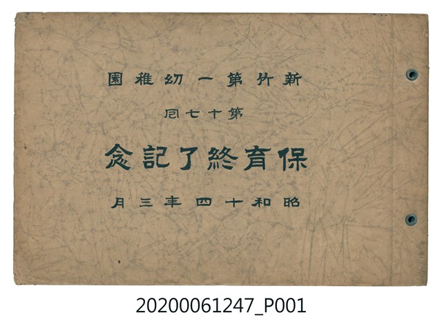 1.本物件是新竹第一幼稚園第十七屆畢業紀念冊。採橫式印刷,硬殼線裝。封面以灰色為底,由上而下依序書寫「新竹第一幼稚園」、「第十七回」、「保育終了記念」、「昭和十三年三月」等4排字。內容收錄園長、保姆、幼兒個人照與合照,以及校園景觀。