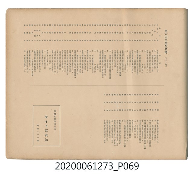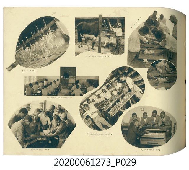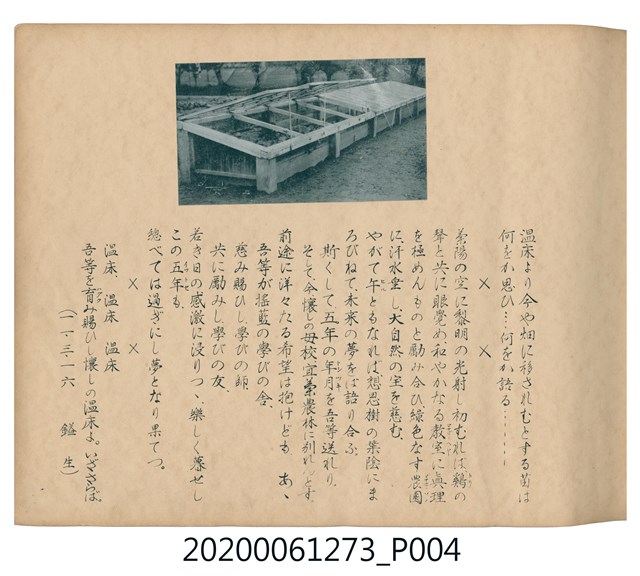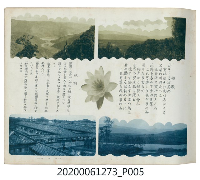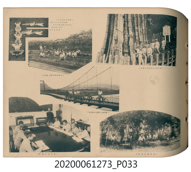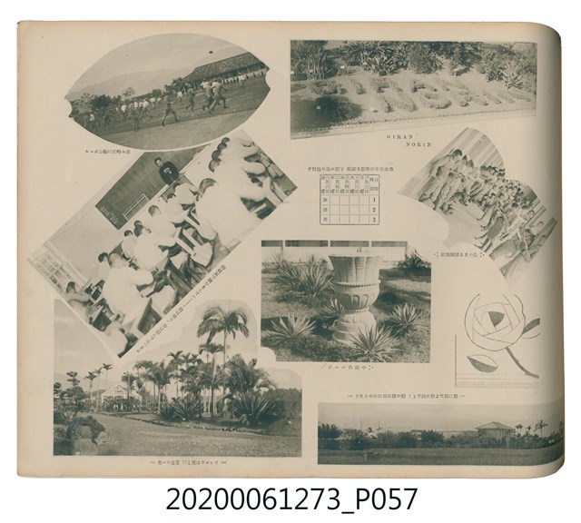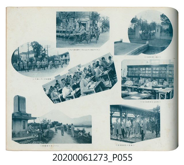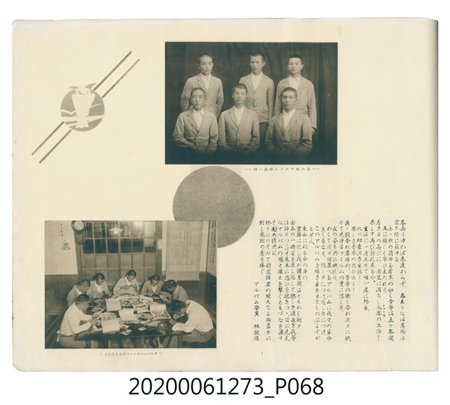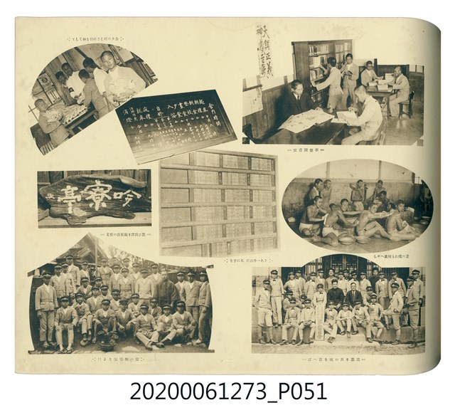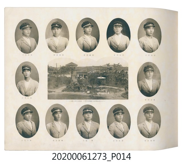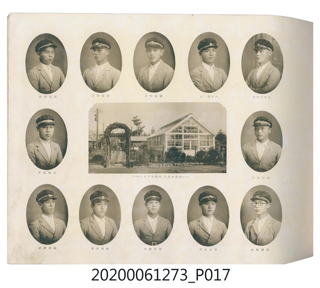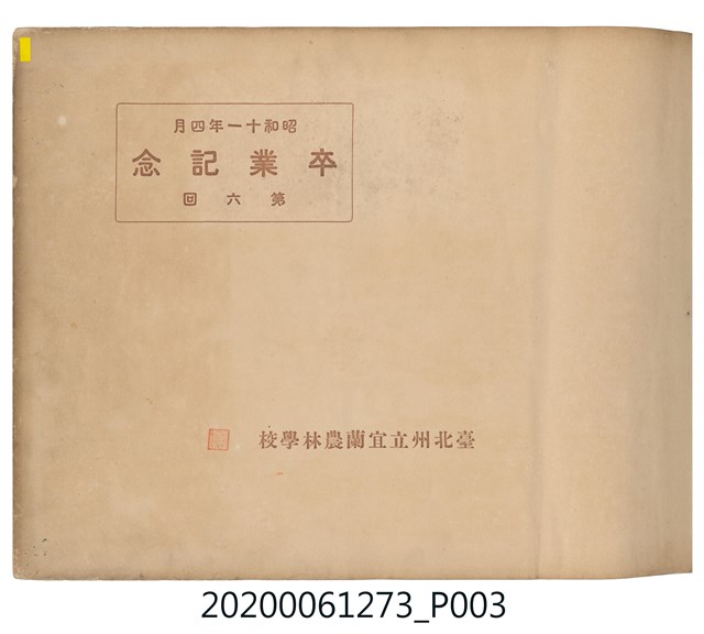 1.本物件是ライト寫真館製作的《臺北州立宜蘭農林學校第六回卒業記念寫真帖》。採橫式印刷,線裝。封面以綠色為底,右半部繪製椰子樹和校舍的圖像;左半部有「溫床」、「2596」字樣,數字代表皇紀2596年,即1936年;左下角書寫校名和書名。內頁封面左上設計方框,方框內印日期和書名;右下是校名,校名左側蓋有方印。內容收錄校旗、校歌及校長、教職員、學生個人照;、合照及生活照,尚有校門、校舍及校園景觀照,照片之後為畢業生名單和住居地。最後一頁左下有小方格,格內寫真館資訊。2.臺北州立宜蘭農林學校創立於1926年,招收公學校、小學校畢業生,修業年限5年,前4年修習普通學科,第5年分習農藝、森林兩科專業課程。創校初期借宜蘭公學校(今宜蘭市中山國小)校舍充當教室,1928年新校舍完工後,校址遷入宜蘭市金六結校區。戰後初期更名為省立宜蘭農業職業學校,其後校名幾經變革,現為國立宜蘭大學。