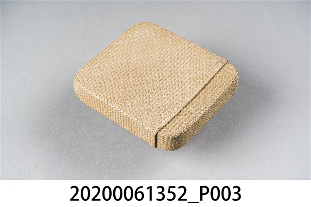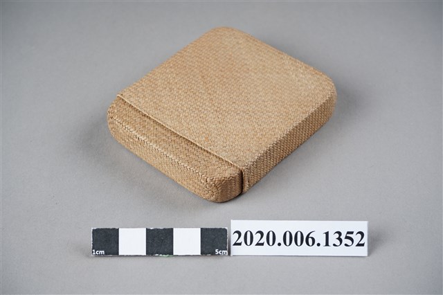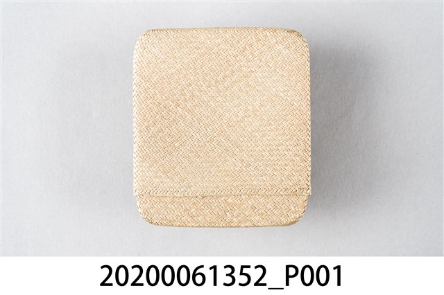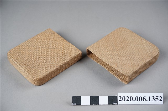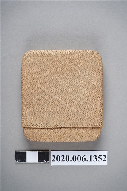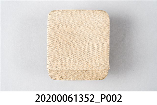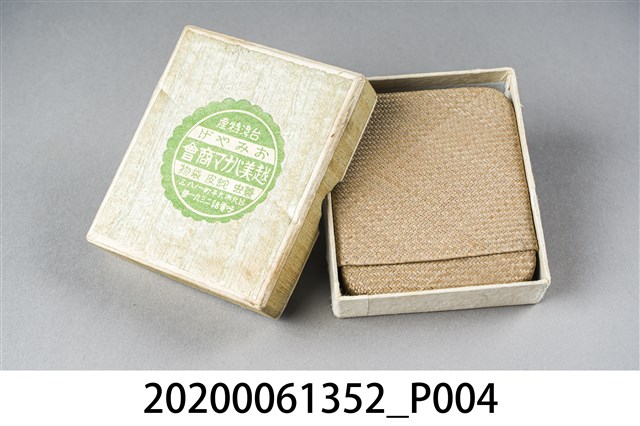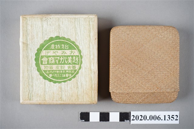 1.本物件為越美巴拿馬商會臺灣特產藺草小盒。以一個木盒包裝,木盒上寫著臺灣特產、おみやげ、越美バナマ商會(按:越美巴拿馬商會),下方寫著蓑蟲、蛇皮、袋物。下方有店家地址和電話。本體是一個藺草製的淡青色小盒子。