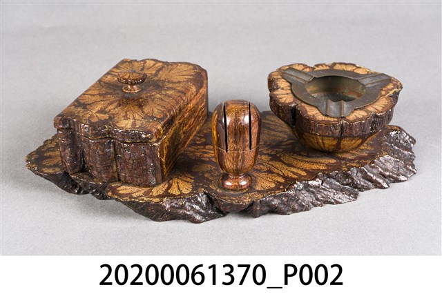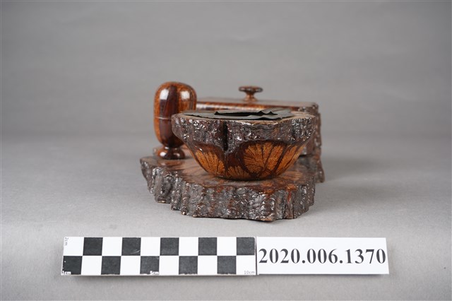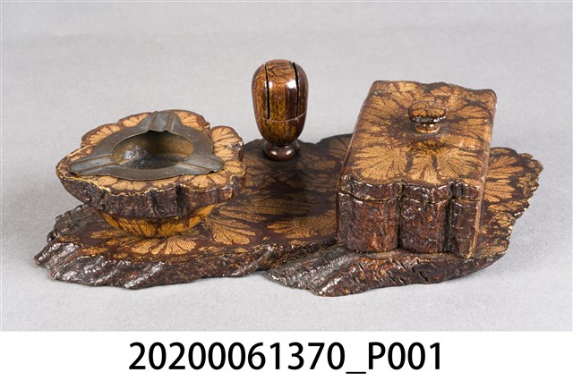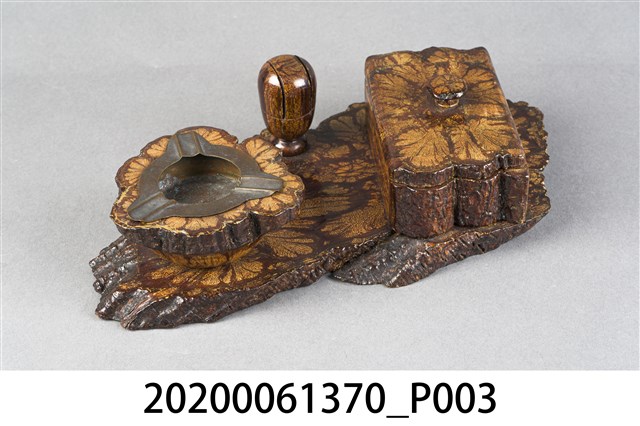 1.本件為菊花木菸灰缸,本件尺寸長28公分、寬14.5公分、高5.5公分。整體顏色呈現深咖啡色。左側有一凹槽且有鐵片,鐵片上有三處凹槽,為放置香菸使用。右側有一長方形盒,放置雪茄或香菸使用的菸盒。中間突起物櫻為切開雪茄或香菸使用之工具。 2.菊花木,中文別名龍鬚藤、九龍藤等,通常分布在臺灣中、低海拔山區的森林。可作為中藥使用,有祛風濕、行氣血之效,治跌打損傷等作用。因菊花木因其莖之橫斷面呈現菊花紋,故得名。也因莖橫斷面具有菊花紋,使得其木材在工藝上頗富利用價值,而其木材則可供製器具之用。