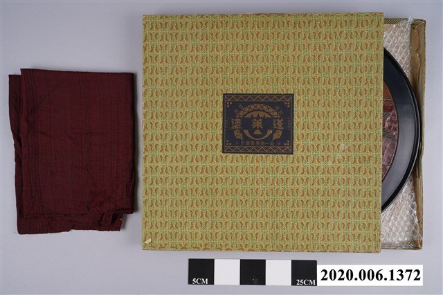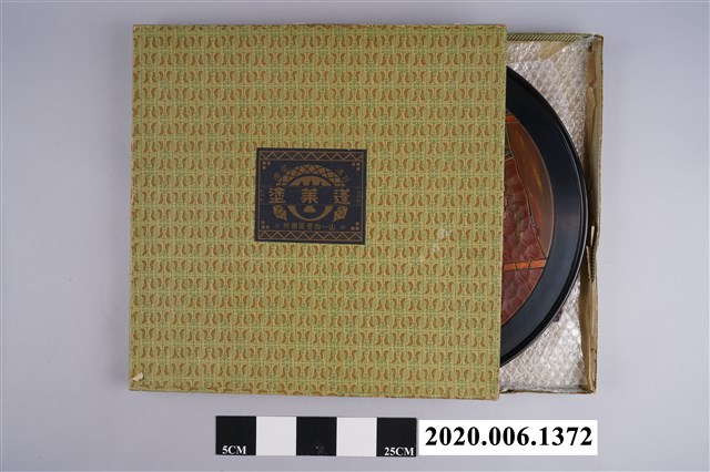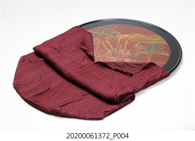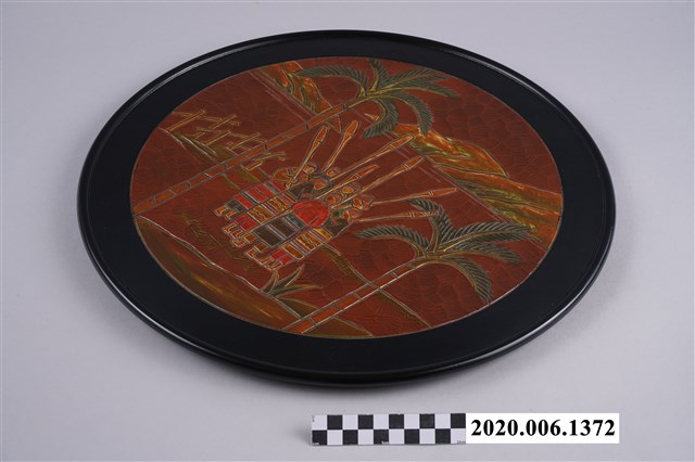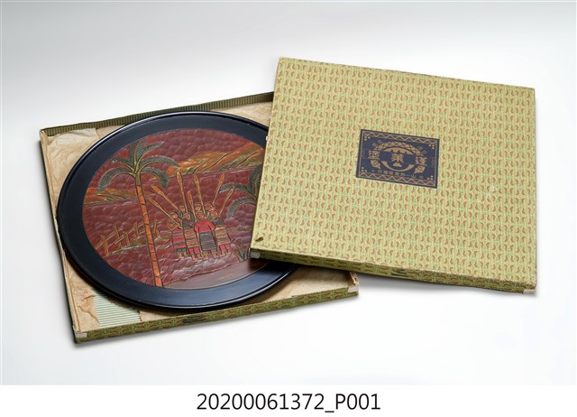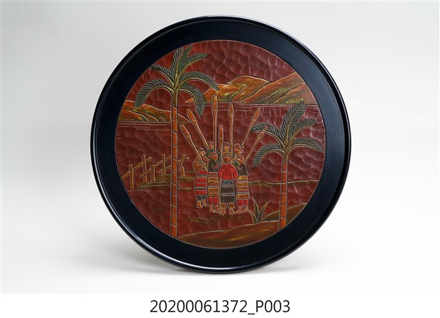 1.本物件為原住民杵歌紋圓盤漆器掛飾。圓形,底色為漆黑色,附有一個防塵套和包裝用紙盒。原盤底部為原住民在椰子樹下唱杵歌的圖案,紙盒上貼有「臺灣名產 蓬萊塗 山一物產販賣所」字樣。2.日治時期,日月潭為重要的觀光勝地,因應觀光需求,便使用杵歌來招徠遊客,同時為了增加生動的程度,另外再加上歌唱的表演。「杵」長短粗細不一,長者可達到一個半人高,短者有一個人高,杵的形狀為兩頭粗、中間細,枝數在七或八支均可,大夥兒圍著一個埋在土裡只露出平坦面的石頭,輪流舉起長杵用力舂擊,產生「叮叮噹噹」的「杵音」。邵族人舂石音的時候,旁邊通常還會有兩三個人拿著短竹筒敲擊地面,發出低沉的伴奏聲,配合長杵衝擊在石頭上的聲響,為日治時期的臺灣八景之一。