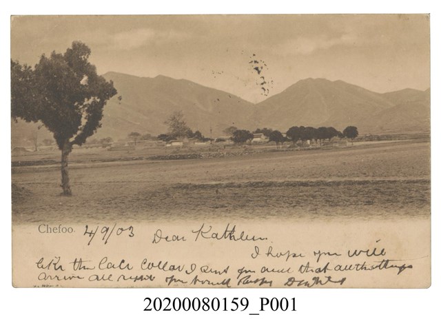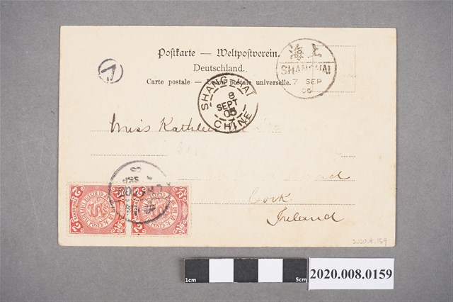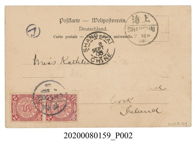 風景片貼蟠龍2分直雙連銷煙台1905.9.3戳寄愛爾蘭, 另銷上海1905.9.7過路戳及上海1905.9.8法國客郵戳