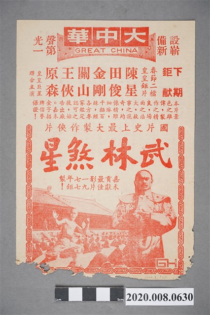 1. 香港電影《南龍虎群英》於臺灣的大中華戲院上映時的雙色電影本事單張。封面上有「南龍虎群英 本事」及介紹電影故事梗概,版頭標有「恭賀新禧」、「大中華戲院全體同仁 鞠躬」,左下角標明「小心火種・謹防火災!」、「台北市政府警察局製」。本事單張背面為影片廣告,介紹《武林煞星》,版頭標明「大中華 GREAT CHIA」、「設備嶄新」、「聲光第一」廣告文字,其餘版面標明「國片史上最大製作武俠片」、「嘉禾貢獻最佳影片一九七七年鉅製!」等廣告文字,並列出主演演員名單。2. 香港電影《南龍虎群英》,又名《江南八大俠》為1977年由香港金鑫影片公司出品的古裝功夫電影,由歐陽俊導演、張信義編劇,陳全、李超武術指導,岳華、羅烈、徐楓等人主演。歐陽俊本名蔡揚名,臺灣導演,曾以藝名陽明擔任演員,為1960年代為紅極一時的台語片小生。1970年代他赴香港發展,成為邵氏公司簽約導演,離開邵氏後以「歐陽俊」為名導演電影,於1970年代代導演多部功夫片,包含《旋風方世玉》(1977)、《大地飛鷹》(1978)等。