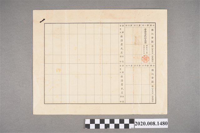 昭和11年臺灣拓殖株式會社股票金五百圓,銷參錢印花戳, 附3張完整收費單難得, 股票於光復後加蓋臺灣省日產清算委員會登記戳