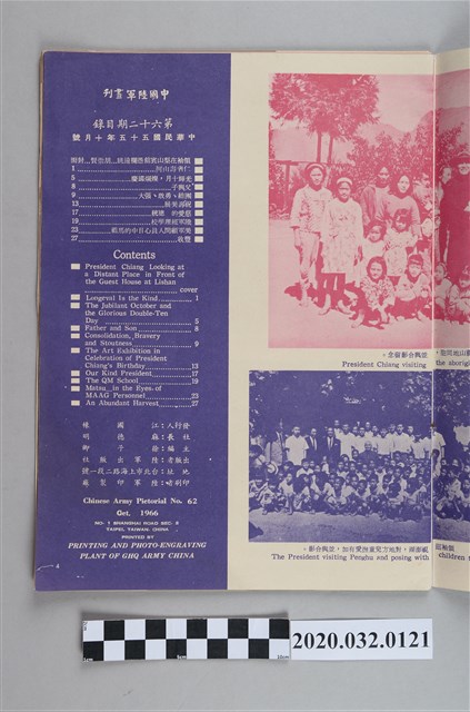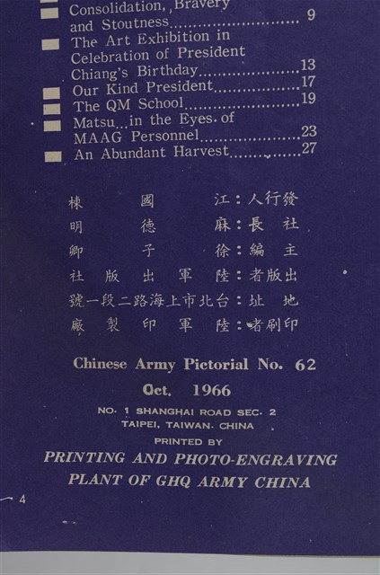 1.本書為《中國陸軍畫刊》第26期,由陸軍出版社於民國55年出版。 2.本館無相同館藏,但有部分黨國出版之畫報及雜誌。 3.此物件之意義可作為理解戰後臺灣政治氛圍及社會網絡關係之史料,該主題物件亦反映臺灣當時黨國治理的政治氛圍。館內既有館藏目前較少觸及戰後「反攻大陸」時期之蒐藏,此系列之物件可深入進行與黨國意識塑造及統治正當性相關的主題研究。