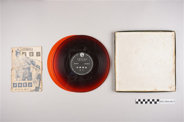 麗鳴唱片廠出品編號「LM-338」《山歌姻緣》電影歌曲專輯,為該片全部電影主題曲及插曲,由靜婷、江宏演唱,分為唱片盒、唱片、歌本等3部分。(1)唱片盒以厚紙製作,封面為主要演員喬莊、杜娟劇中扮相彩色圖樣。(2)唱片計有3張6面,皆為33又1/3轉10吋塑膠唱片。(3)電影主題曲歌本,中間被撕損,封面及封底印有電影劇照。曲目包括〈捕魚人兒世世窮〉、〈兩田西瓜不同籐〉、〈水深沒有你心深〉、〈蝶戀花〉...等。 《山歌姻緣》(Songfest, 1964)為邵氏公司出品,1964年臺灣上映,袁秋楓導演,杜娟、石燕、喬莊主演的黃梅調電影。