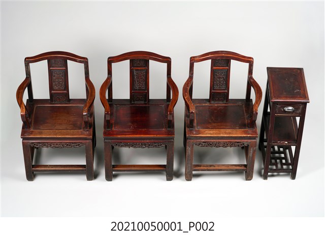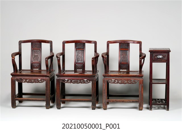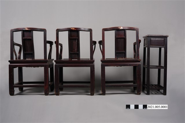 1.此組扶手椅為日本時代臺灣漢體風格家具,整體線條簡潔、風格素雅。頂枝未出頭,三結式後憑板並雕有福字及花草紋、無插角花,椅面下有束腰無裝飾,勒水以透雕花草如意紋裝飾,四腿造型為鈎線造型,站檔無造型。椅腳有明顯磨損,椅組整體結構完整。據捐贈者描述,椅組未特別保養及修理,色澤為長年放置的自然顏色。