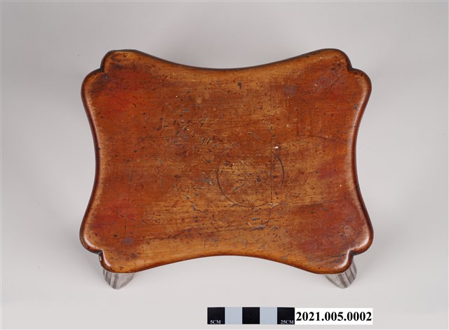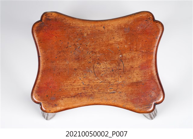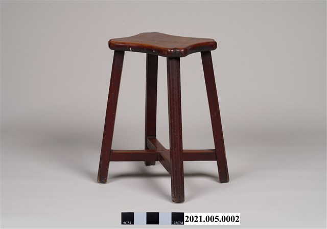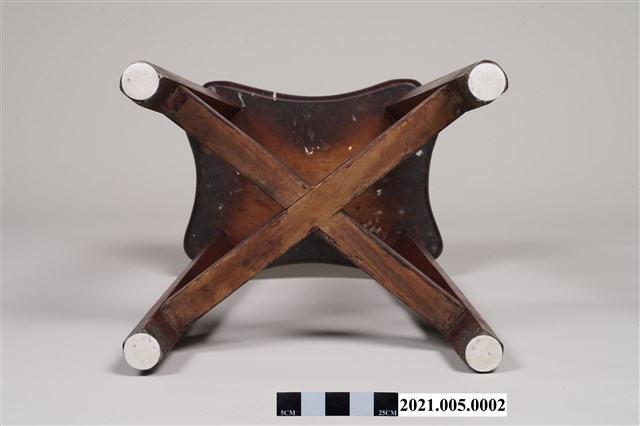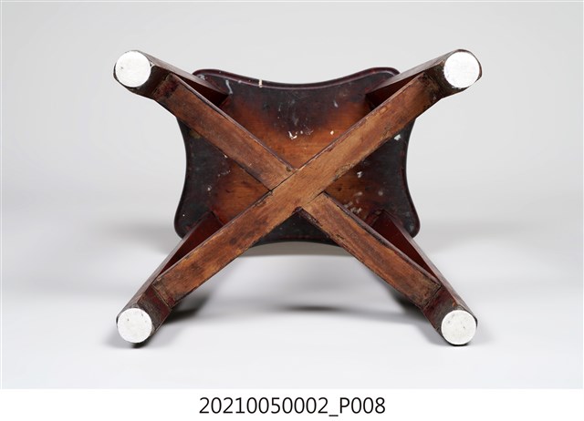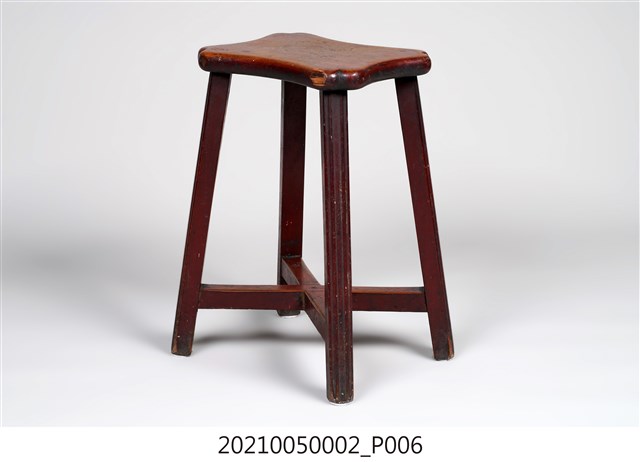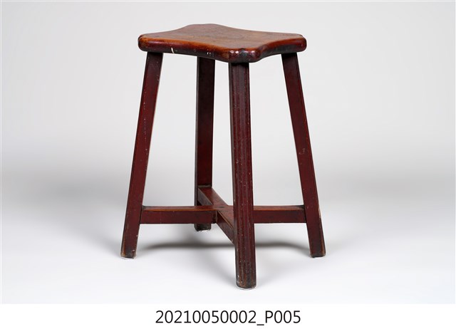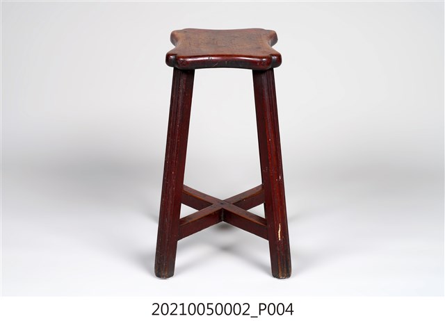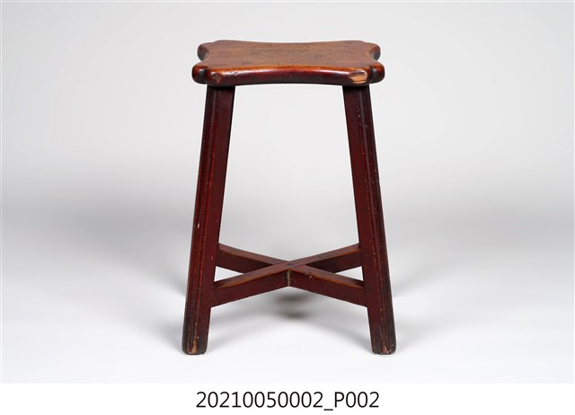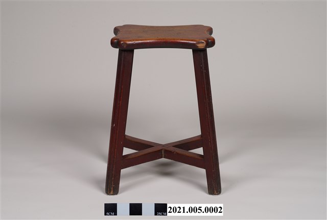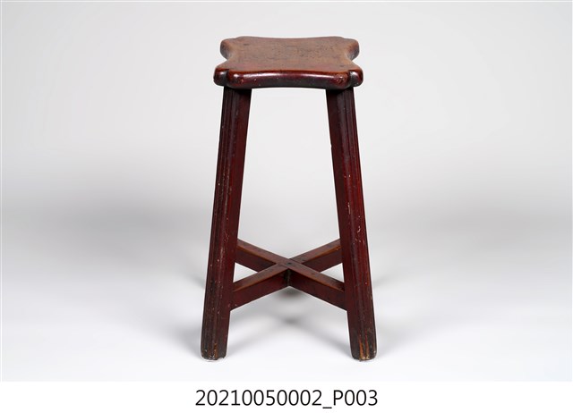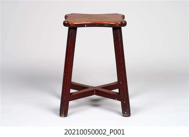 2.本件為無靠背之木製坐凳,俗稱椅鼓頭、椅頭仔。本件非為一般常見的圓形椅面,其椅面4邊為對稱曲線、邊角帶花邊,椅腳側邊有裝飾線條,外形簡單而典雅。椅腳以交叉橫木接合固定。椅面側邊缺漏一角,但保存完整。