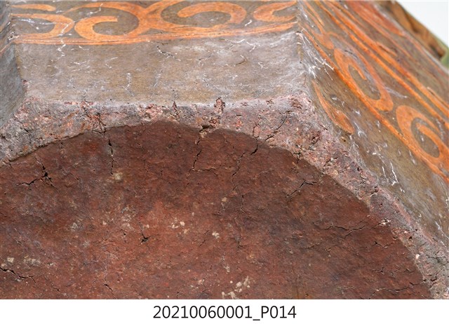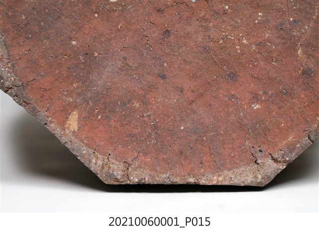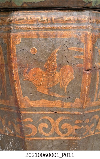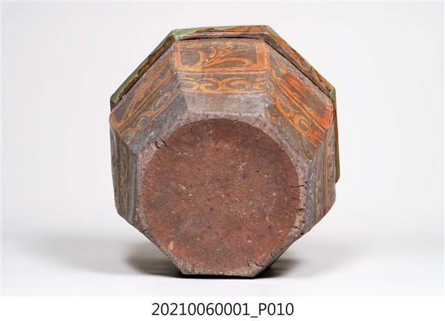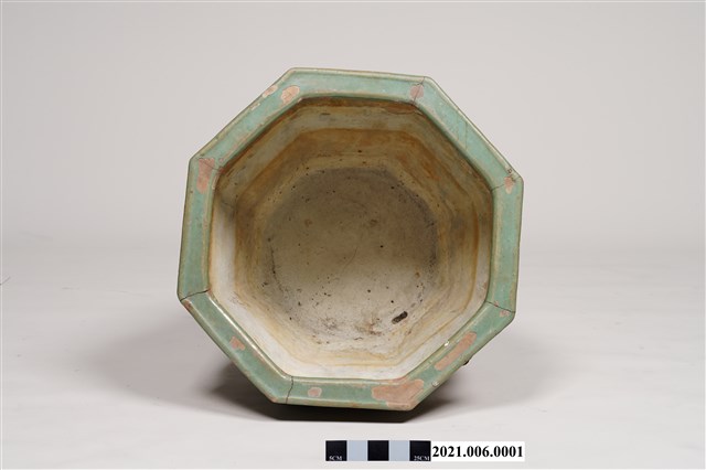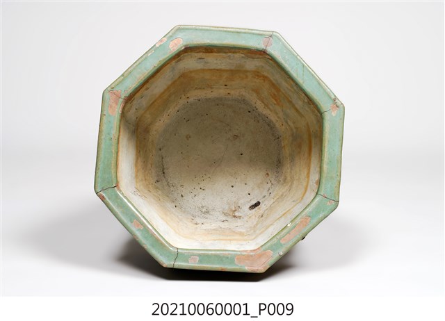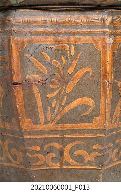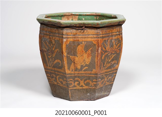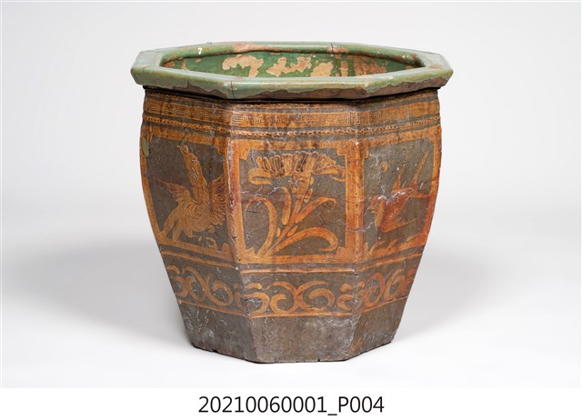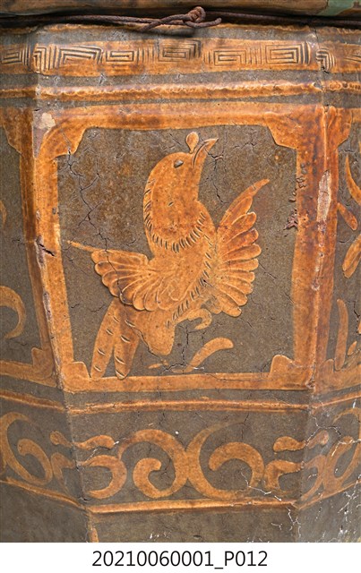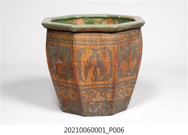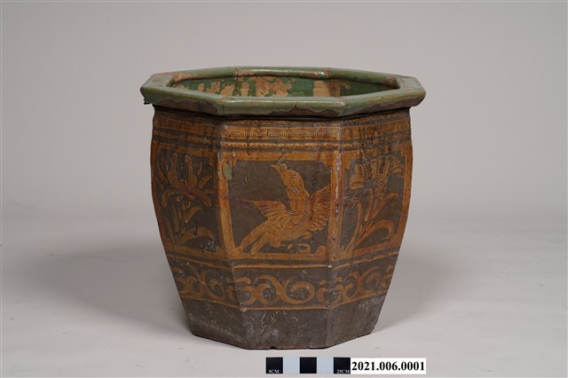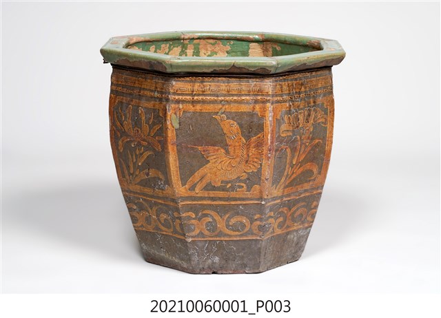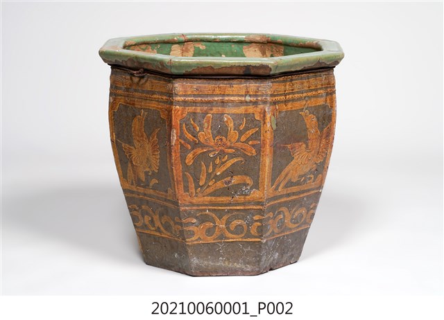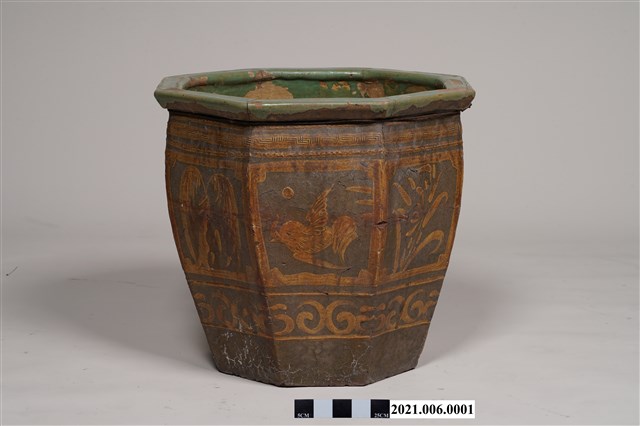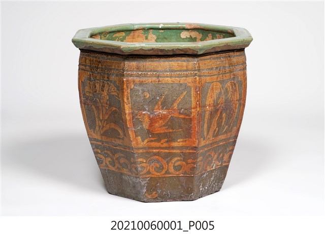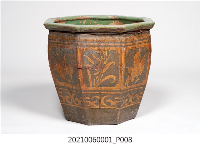 1. 本件為捐贈者雲林斗南老家所帶來之醬釉八角陶缸,外形呈八角形,平底,底部較小,向上逐漸敞開,至口部最大,平唇。器身具有稜角,外表以深褐色釉為底,每面有黃褐色淺浮雕立體圖紋裝飾,技法包括貼塑、壓印、雕刻等,八面各有不同的方形開光主題,包括雀鳥、花草、椰子樹、幾何紋等。缸口施綠釉,缸內施白釉,器表釉料因年代久遠而出現龜裂剝損現象。本件可做為水缸、魚缸、蓮花缸等用途,據捐贈者描述母親曾拿來放米。