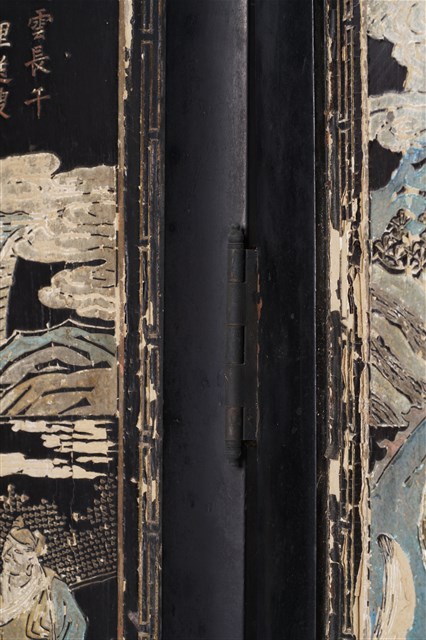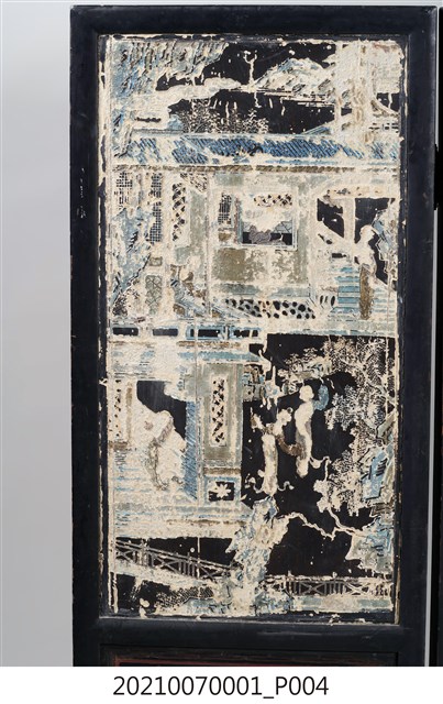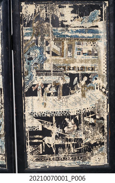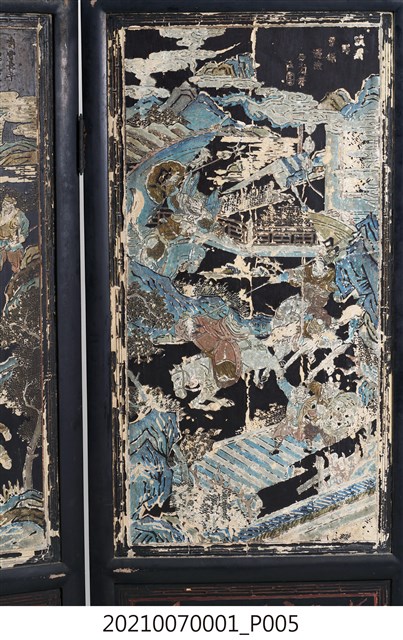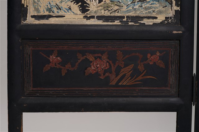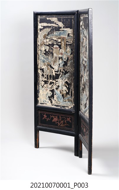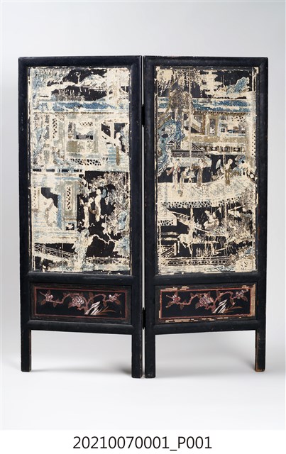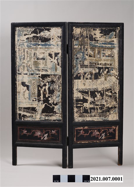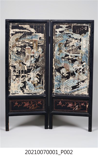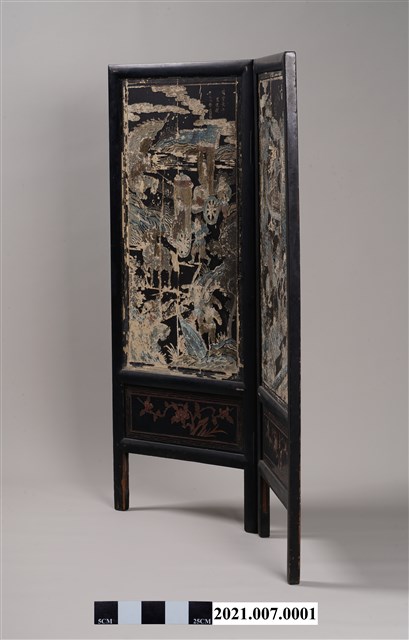 木製折扇式屏風,尺寸規格接近日式「本間屏風」,以木作榫接製作而成,表面以鯛漆裝飾,現存狀況仍可對折,並以金屬活頁連結,屏風展開時能穩定站立,屏風左右扇分別有兩則故事,左扇故事主題為關雲長千里送嫂,右扇故事主題為戰濮陽曹操遇險,故事下方均有花草圖飾,屏風正反面均有漆膜剝落的現象,部分圖像無法辨識清楚。主要被擺設在文士閣溫泉會館大廳入口處。