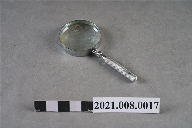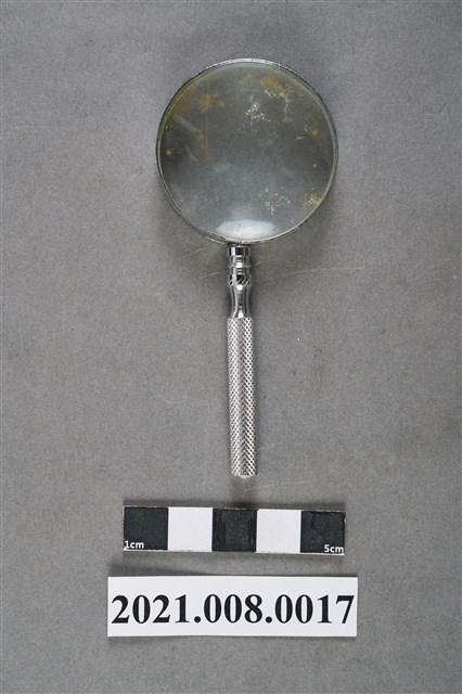 此放大鏡整體為鐵銀色,握柄處有防滑的凹凸紋路,鏡片邊緣有些生鏽。