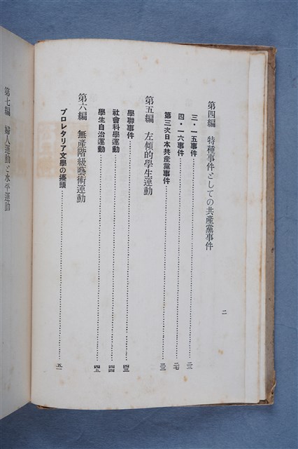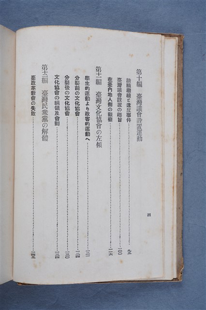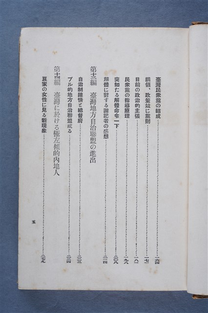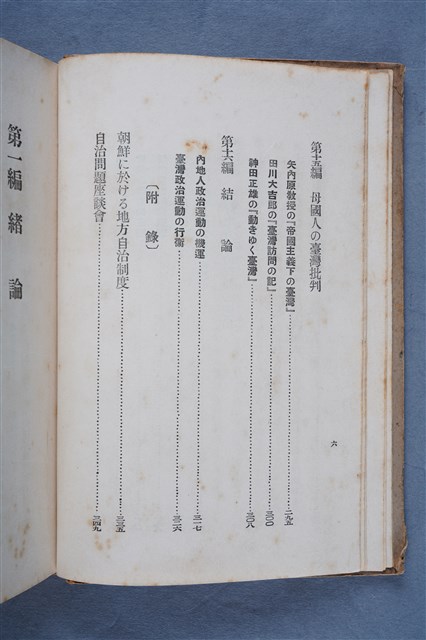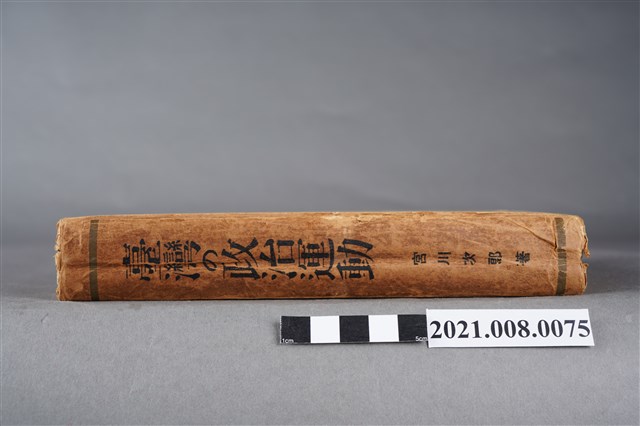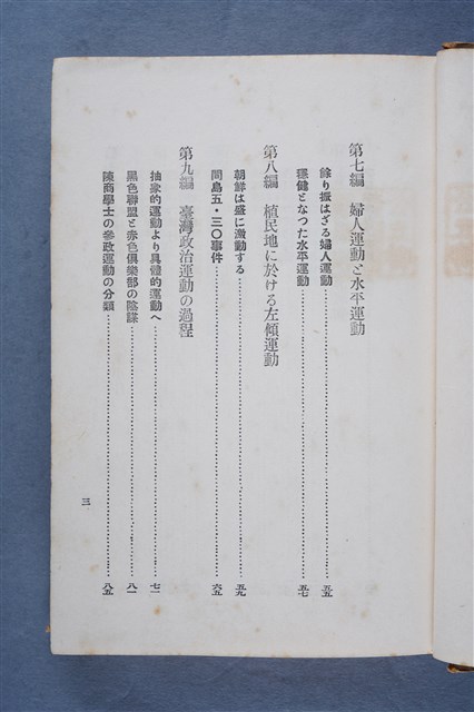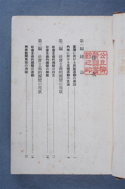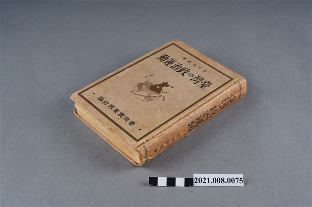 本件為《台灣の政治運動》,作者為宮川次郎,由臺灣實業界社於昭和6年(1931年)8月出版。本書含「第一編、緒論」、「第二編、社會主義的團體の現狀」、「第三編、社會主義的團體の現狀」、「第四編、特種事件としての共產黨事件」、「第五編、左傾的學生運動」、「第六編、無產階級藝術運動」、「第七編、婦人運動と水平運動」、「第八編、植民地に於ける左傾運動」、「第九編、臺灣政治運動の過程」、「第十編、臺灣議會設置運動」、「第十一編、臺灣文化協會の左傾」、「第十二編、臺灣民眾黨の解體」、「第十三編、臺灣地方自治聯盟の進出」、「第十四編、臺灣に於ける極左傾的內地人」、「第十五編、母國人の臺灣批判」、「第十六編、結論」、「附錄」等,共374頁。本書封底貼有「柳營庄圖書館/門名:第5門/番號:第103號/購入日期:6年10月27日」之標籤貼紙,扉頁處蓋有刻「公立柳營圖書館之印」隻紅色方形印章,版權頁背面蓋有「台北市牯嶺街松林書局」之藍色橢圓印章,封底裏有「一九三二、一O、一二 了.S.H。」之鉛筆字跡。