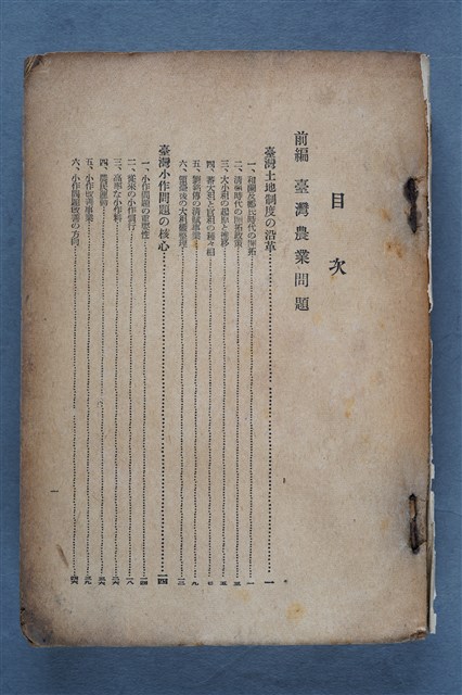 1. 本件為《臺灣經濟と農業問題》,作者為陳逢源,由萬出版社於昭和19年2月出版。本書含「前編、臺灣農業問題」及「後編、臺灣經濟論叢其の他」,共330頁。推測原封面及封底已佚失,本件所見封面及封底,應為盧修一自行加裝,書側有手寫黑字書名「臺灣經濟と農業問題 日文版」。2. 陳逢源(1893年1月3日-1982年8月10日[1] ),字南都,台灣企業家、詩人。台南市人,曾任《自立晚報》常務董事,台北市中小企業銀行,台灣煉鐵公司董事長,台灣省合會儲蓄事業協會理事長。