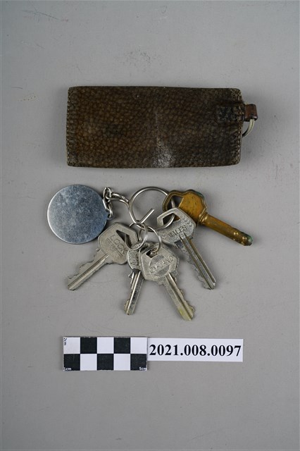 1. 盧修一所有鑰匙及其深咖啡色鑰匙皮件。2. 盧修一(1941年-1998年),臺北縣(今新北市)三芝人,建國中學畢業後考入國立政治大學政治系,畢業後,轉入中國文化大學政治學研究所取得碩士學位;1971年轉學至巴黎大學,1980年以「日本統治時期的台灣共產黨」作為論文題目,取得法國巴黎大學政治博士,曾任教於中國文化大學、國立清華大學、亦曾任民進黨立法委員。