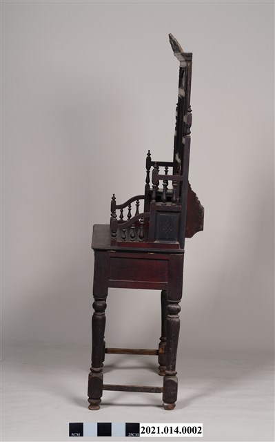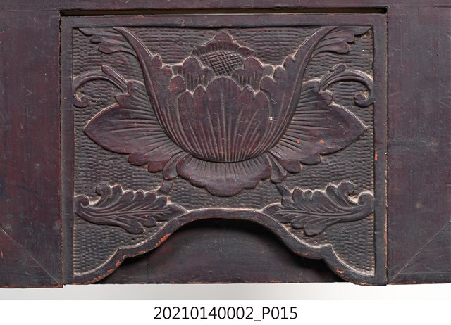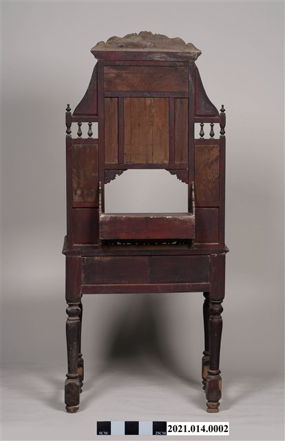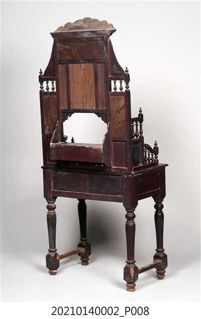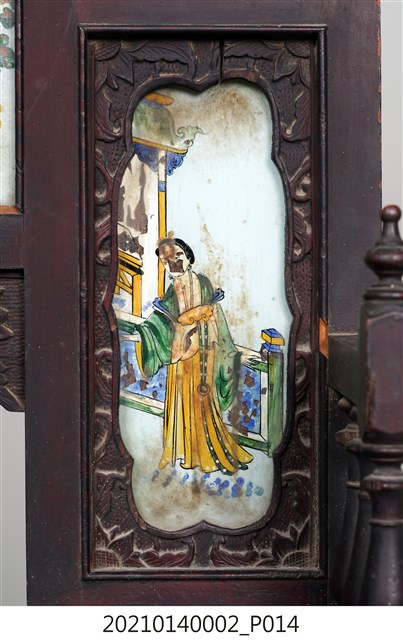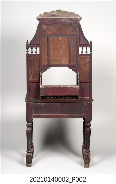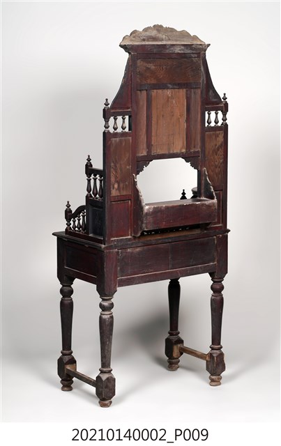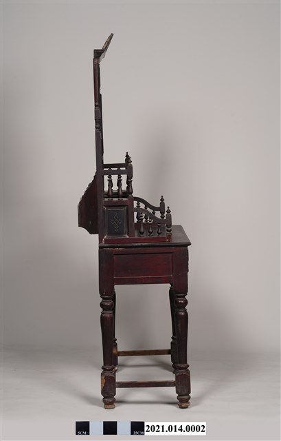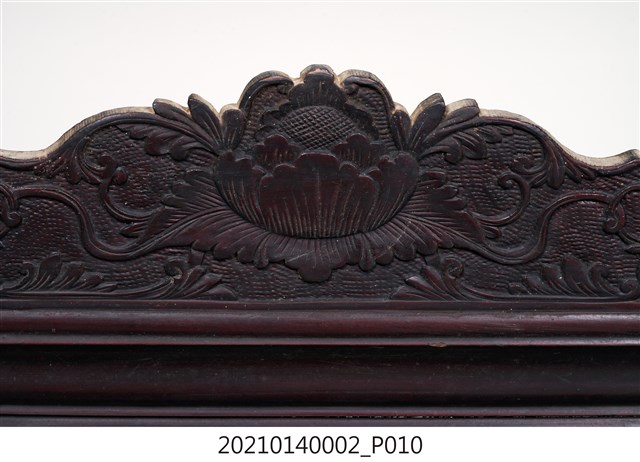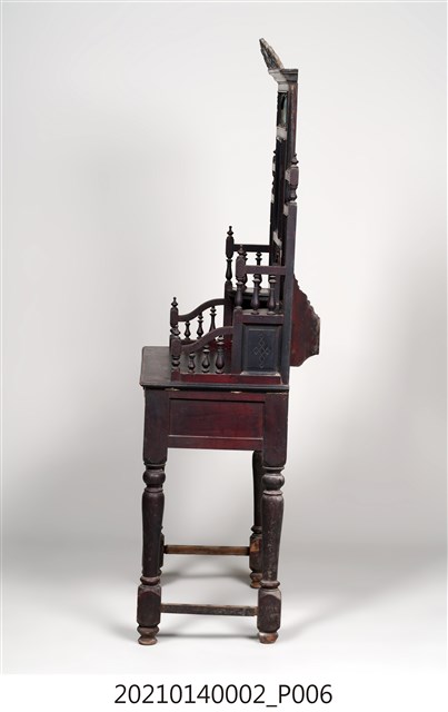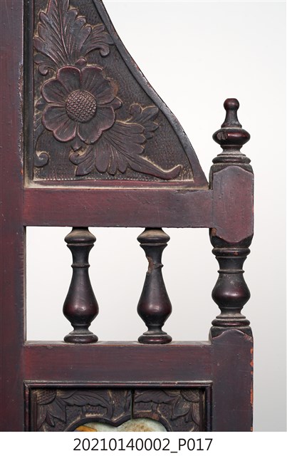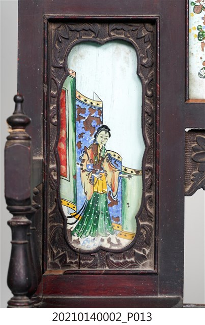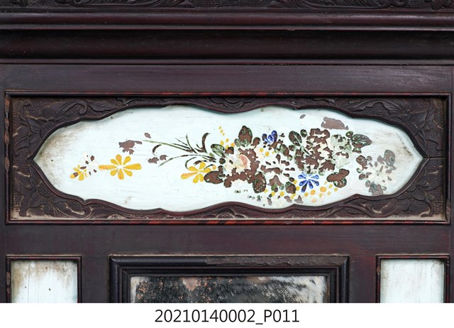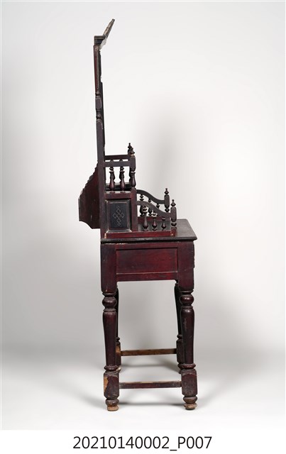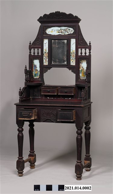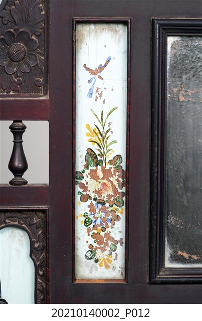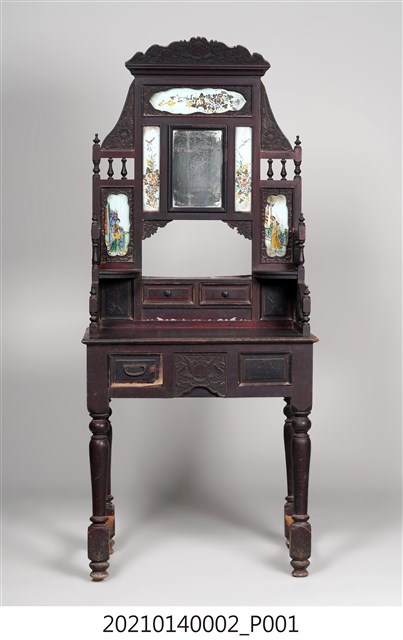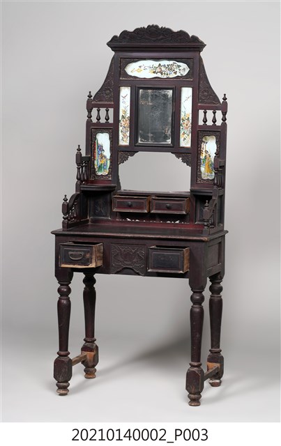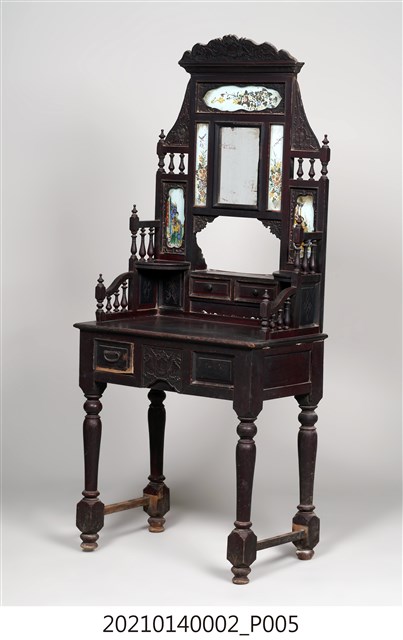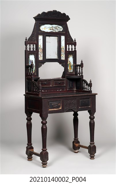 2. 黑漆鑲彩繪玻璃梳妝臺,表面通體施黑漆,漆料中略透赭紅。頂層塔頭蓋較小,裝飾牡丹紋浮雕牙板,中層壁板中央唯一方形照鏡,照鏡上方鑲嵌一橫幅花草紋彩繪玻璃畫,左右兩側各有一直幅花草紋與仕女圖玻璃畫,玻璃畫圖曾有多處剝落。壁板底層連接桌面處,左右各有一捧盤與車枳欄杆,正中央有兩只小抽屜,可放置小物。桌面為長方形,下方左右有兩只小抽屜,正中央為牡丹花浮雕板。桌腳為四車枳腳,左側與右側前後支腳間均有支架輔助。