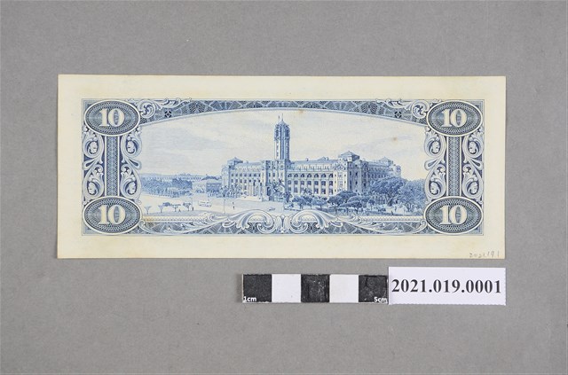 本件為1960年中央銀行製版、1963年1月14日發行之流通於臺灣的拾圓新台幣,編號為「T207539C」。正面圖向左為孫文頭像,右方風景為西螺大橋,鈔票背面為總統府。鈔票正面另蓋有兩個紅印,右為「臺灣銀行董事長」,左為「臺灣銀行總經理」。此款拾圓鈔券為藍色版,另有玫瑰紅版於1968年8月1日發行。