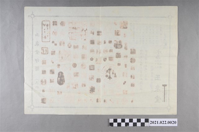 山梨縣甲府市三日町玉泉堂,其業務商品包含水晶眼鏡、水晶細工品、水晶印鑑篆刻;此為水晶印鑑篆刻的樣式圖表,左下方有玉泉堂電話102,及轉帳帳戶東京5064。